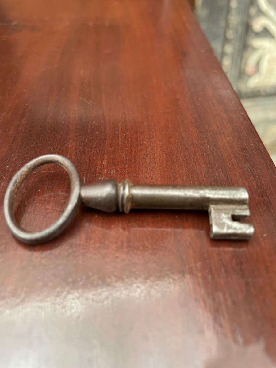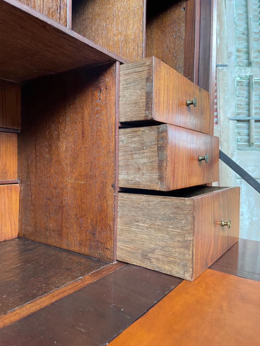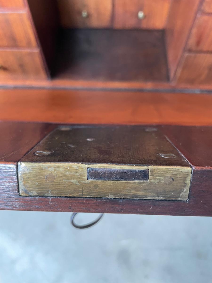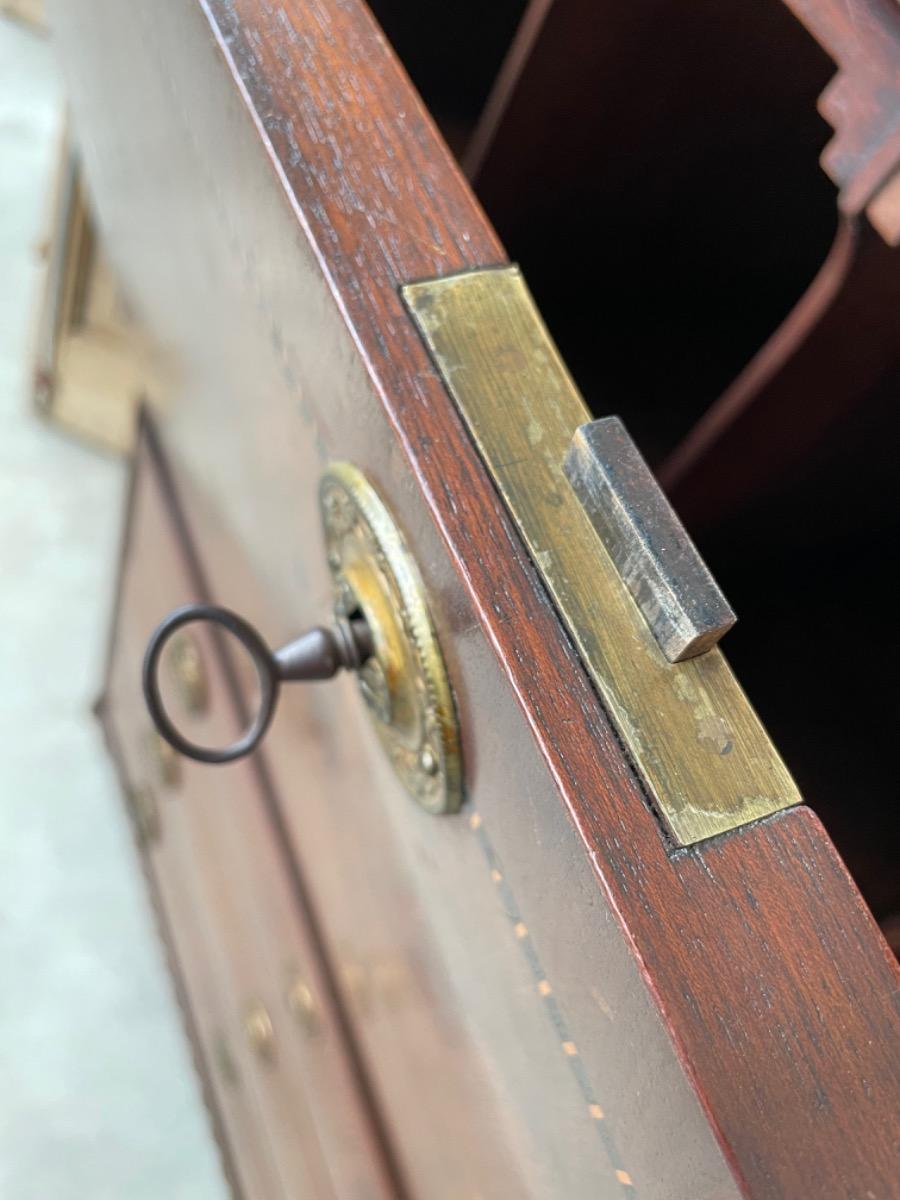 Overhoeks platte hoeken, het geheel op tapse poot. Doorlopend mahonie fineer (op eiken). Vuur vergulde knopjes in interieur, oorspronkelijk slot en sleutel in de klep. Klep ingelegdd met congnac kleurig soepel klafsleder.