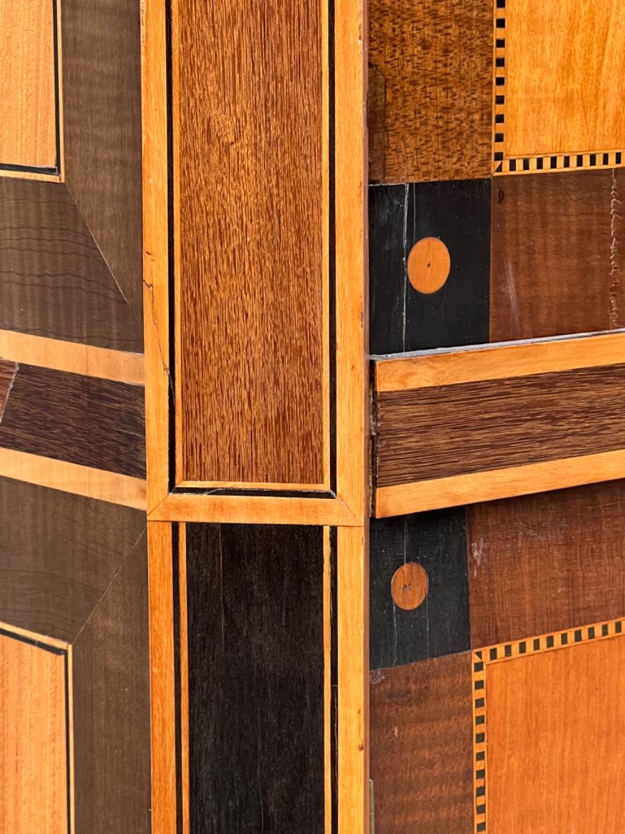 Frontaal ingelegd stuk van diverse verschillende tropische houtsoorten (op eiken).