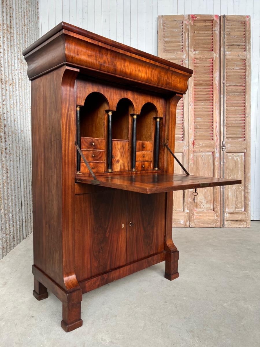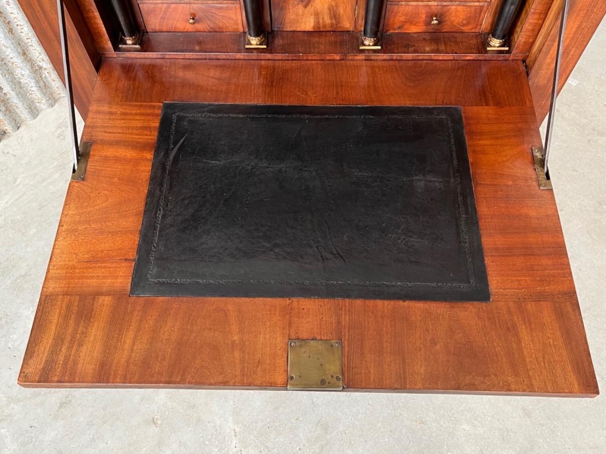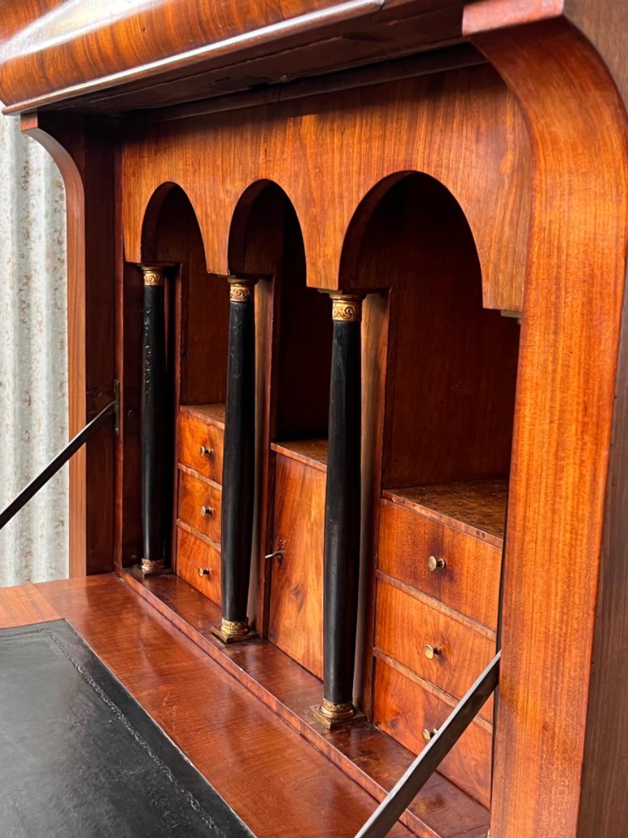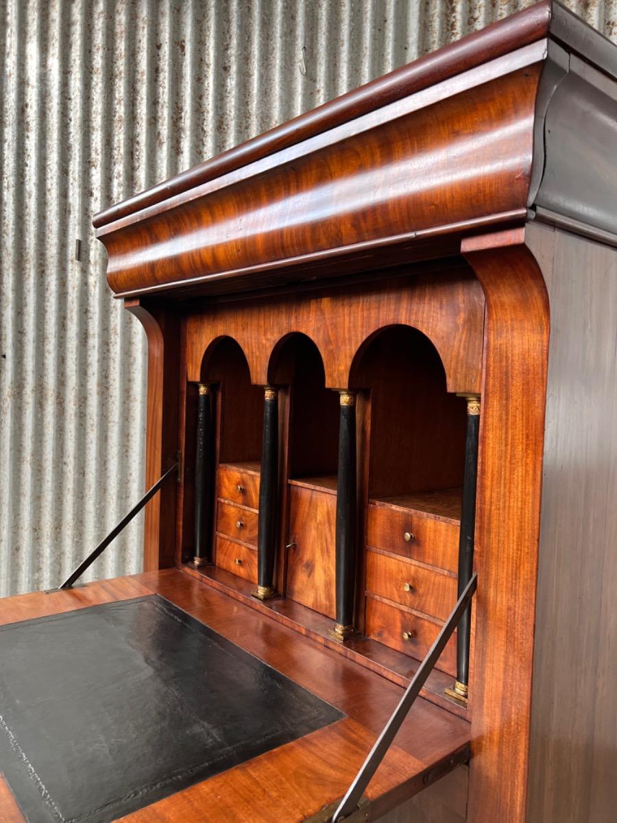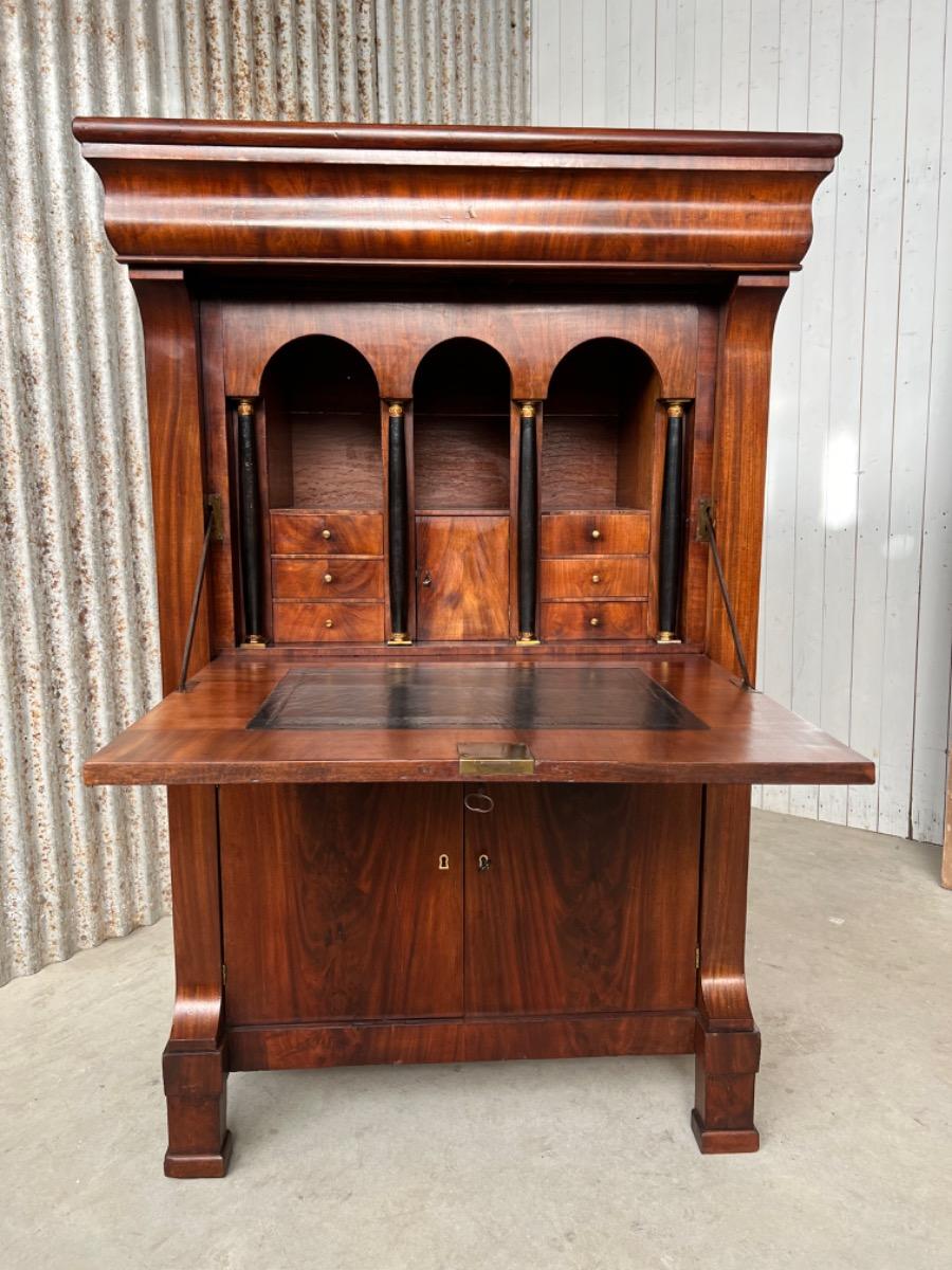 Mahonie secretaire strak model, zeer fraai bloemmahonie gefineerd op eikenhout. Vlakke klep en deuren in de onderkast. Gederagen door empirische blokpoot met plint. Benen entreé's, 7 laden in het interieur waarvan een achter het centrale deurtje. de twee rijden laden worden aan beide zijden geflankeerd door gewarte pilaren met vuur vergulde pilaren. Ik de kap 1 "blinde" lade. Sloten en sleutels oorspronkelijk èn werkend. Klep ingelegd is ingelegd met zwart leder. Geen scheuren in zijden of klep. Hollands, omstreeks 1820. Afm: H= 158 cm. B= 94 - 104 cm. D= 40 - 51 cm. Onlangs grondig nagelopen op losse delen van constructie en fineer. Houtworm controle : Geen levende houtworm aangetroffen. 8-12-2021 Sec-2375~