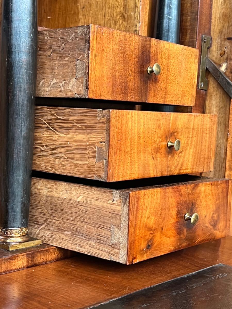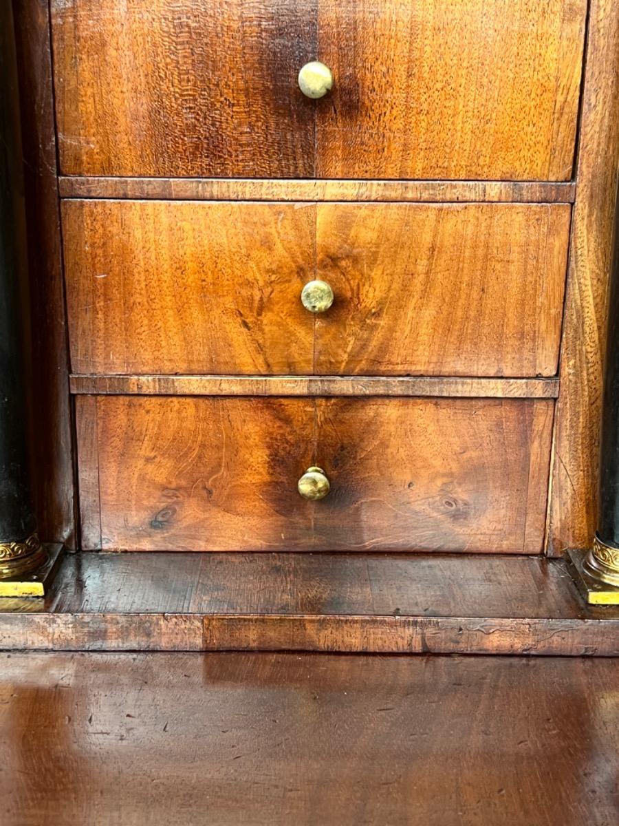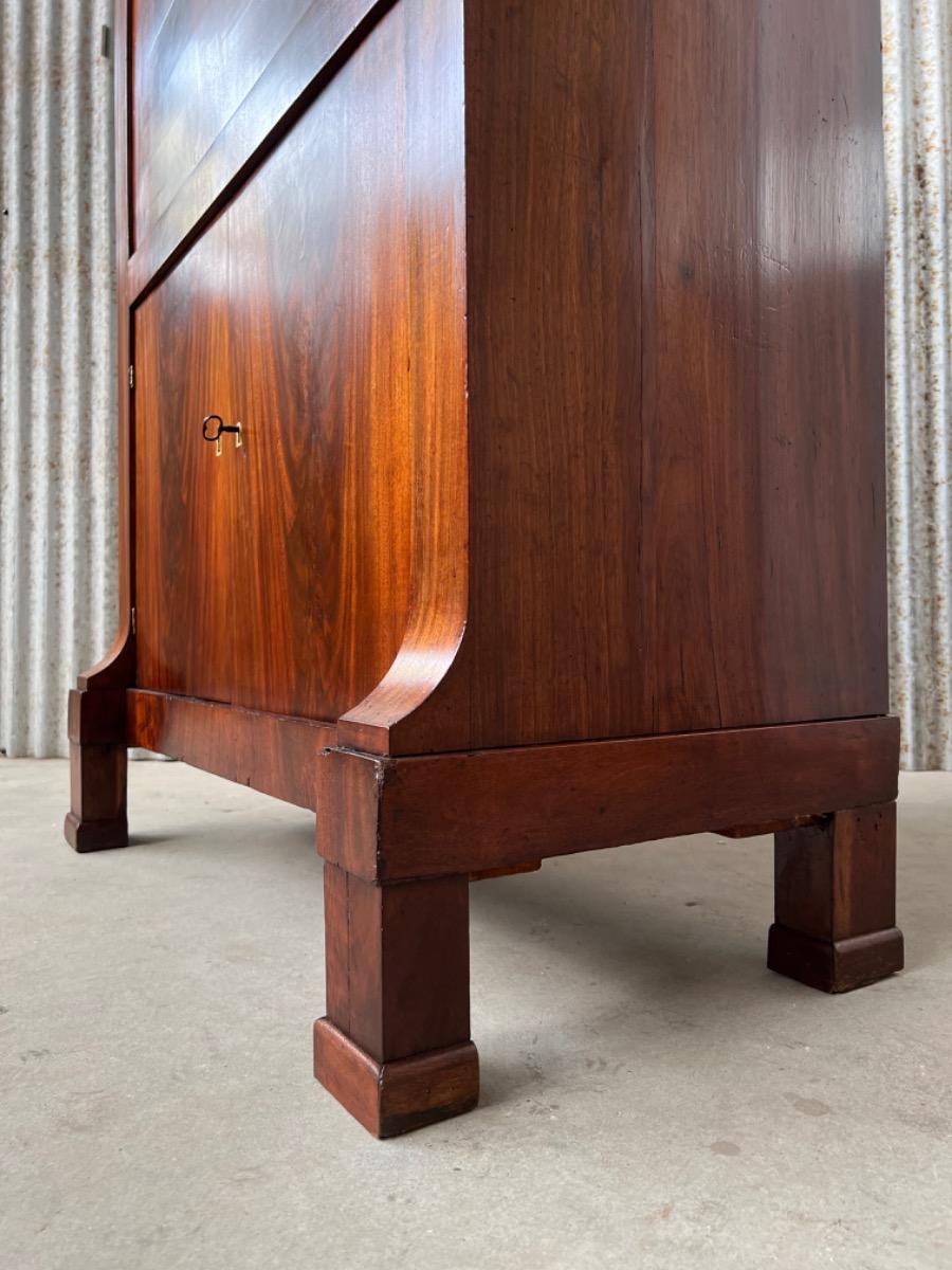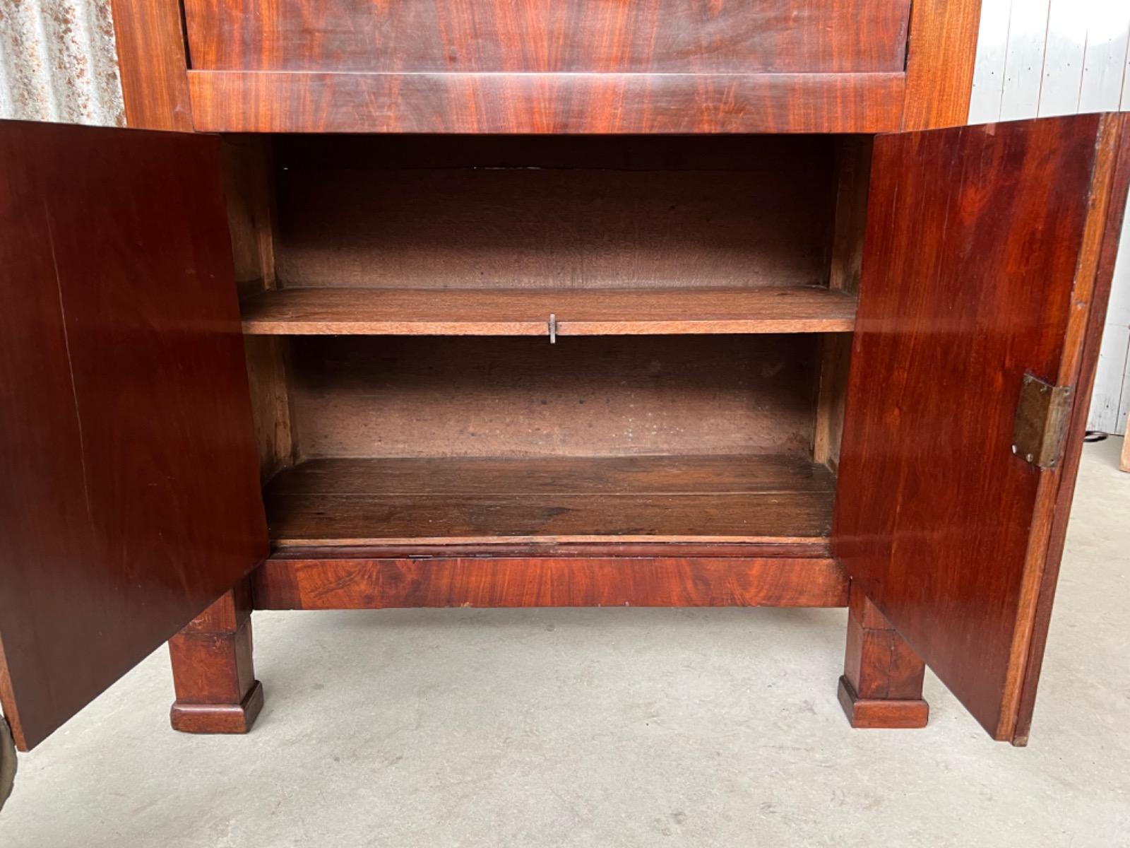 Mahonie secretaire strak model, zeer fraai bloemmahonie gefineerd op eikenhout. Vlakke klep en deuren in de onderkast. Gederagen door empirische blokpoot met plint. Benen entreé's, 7 laden in het interieur waarvan een achter het centrale deurtje. de twee rijden laden worden aan beide zijden geflankeerd door gewarte pilaren met vuur vergulde pilaren. Ik de kap 1 "blinde" lade. Sloten en sleutels oorspronkelijk èn werkend. Klep ingelegd is ingelegd met zwart leder. Geen scheuren in zijden of klep. Hollands, omstreeks 1820. Afm: H= 158 cm. B= 94 - 104 cm. D= 40 - 51 cm. Onlangs grondig nagelopen op losse delen van constructie en fineer. Houtworm controle : Geen levende houtworm aangetroffen. 8-12-2021 Sec-2375~