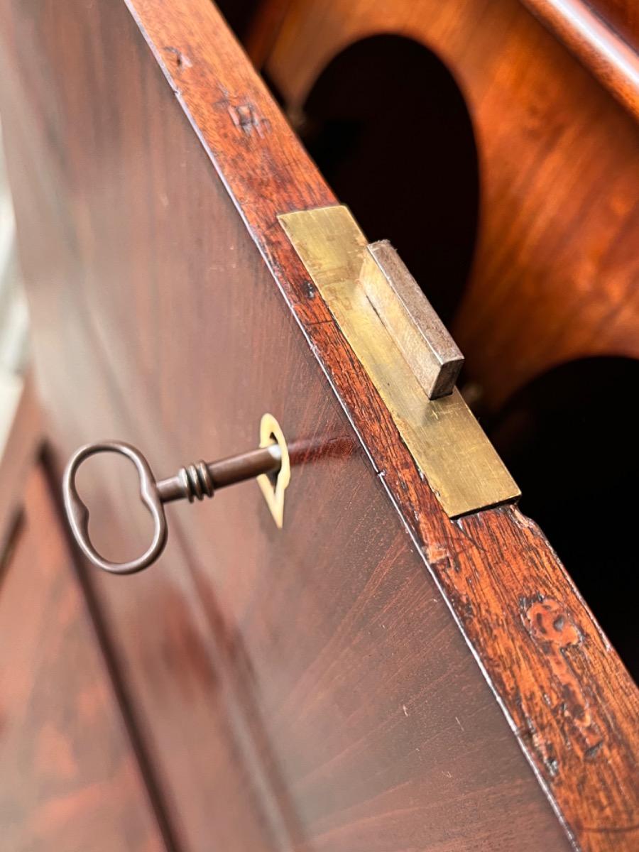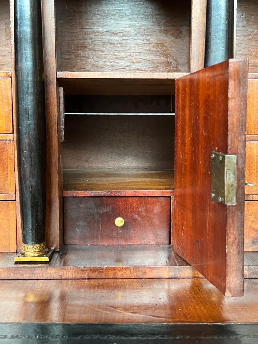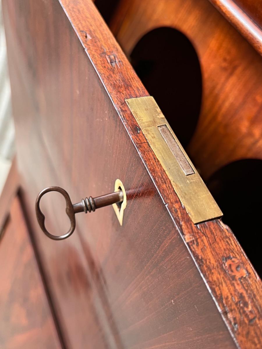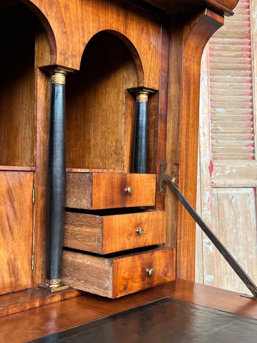 Mahonie secretaire strak model, zeer fraai bloemmahonie gefineerd op eikenhout. Vlakke klep en deuren in de onderkast. Gederagen door empirische blokpoot met plint. Benen entreé's, 7 laden in het interieur waarvan een achter het centrale deurtje. de twee rijden laden worden aan beide zijden geflankeerd door gewarte pilaren met vuur vergulde pilaren. Ik de kap 1 "blinde" lade. Sloten en sleutels oorspronkelijk èn werkend. Klep ingelegd is ingelegd met zwart leder. Geen scheuren in zijden of klep. Hollands, omstreeks 1820. Afm: H= 158 cm. B= 94 - 104 cm. D= 40 - 51 cm. Onlangs grondig nagelopen op losse delen van constructie en fineer. Houtworm controle : Geen levende houtworm aangetroffen. 8-12-2021 Sec-2375~