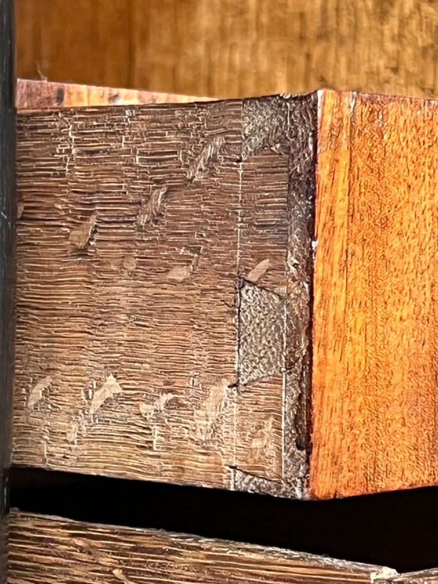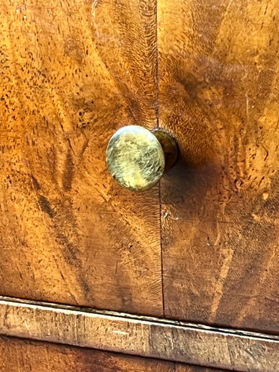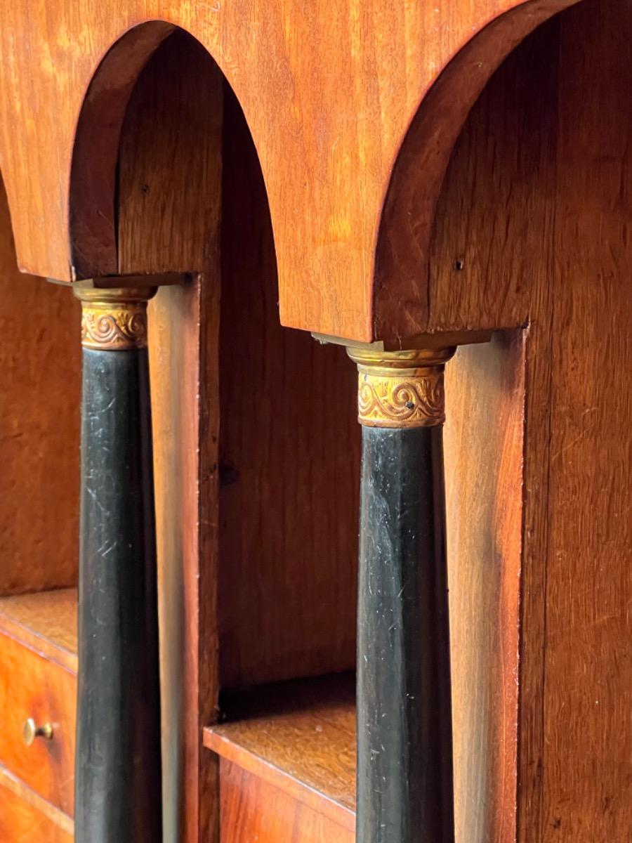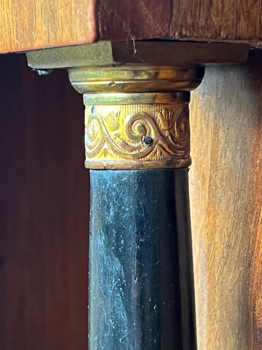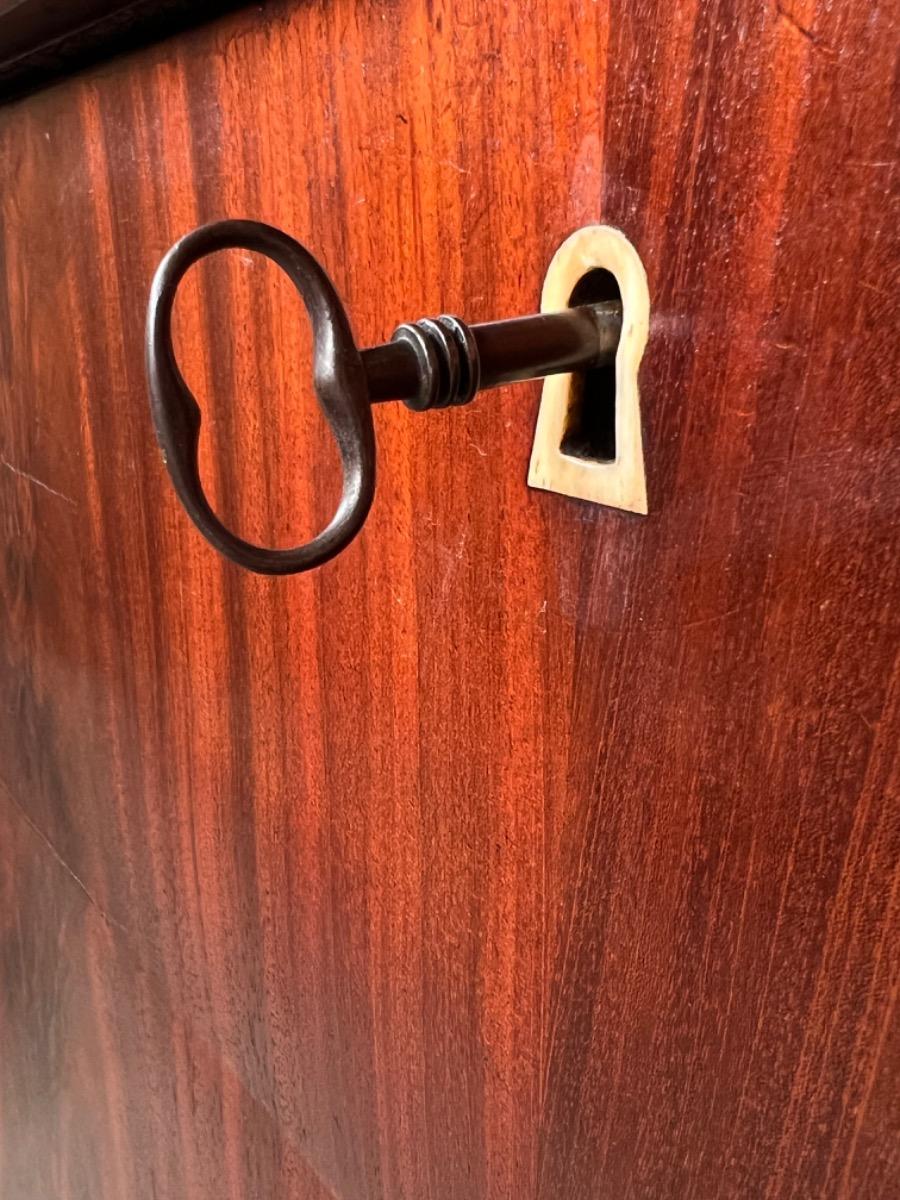 Mahonie secretaire strak model, zeer fraai bloemmahonie gefineerd op eikenhout. Vlakke klep en deuren in de onderkast. Gederagen door empirische blokpoot met plint. Benen entreé's, 7 laden in het interieur waarvan een achter het centrale deurtje. de twee rijden laden worden aan beide zijden geflankeerd door gewarte pilaren met vuur vergulde pilaren. Ik de kap 1 "blinde" lade. Sloten en sleutels oorspronkelijk èn werkend. Klep ingelegd is ingelegd met zwart leder. Geen scheuren in zijden of klep. Hollands, omstreeks 1820. Afm: H= 158 cm. B= 94 - 104 cm. D= 40 - 51 cm. Onlangs grondig nagelopen op losse delen van constructie en fineer. Houtworm controle : Geen levende houtworm aangetroffen. 8-12-2021 Sec-2375~
