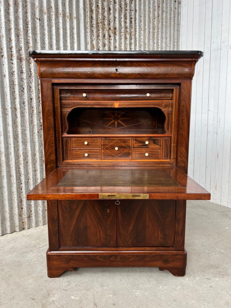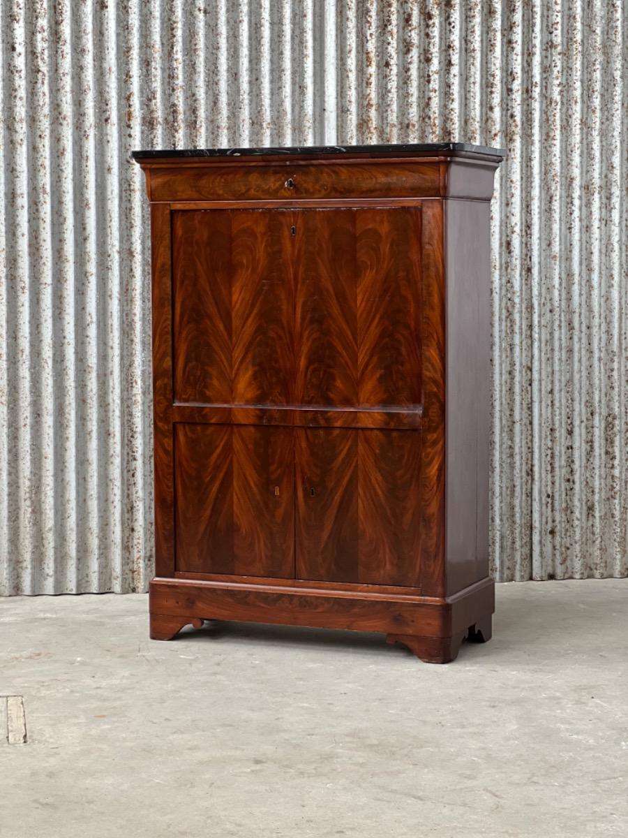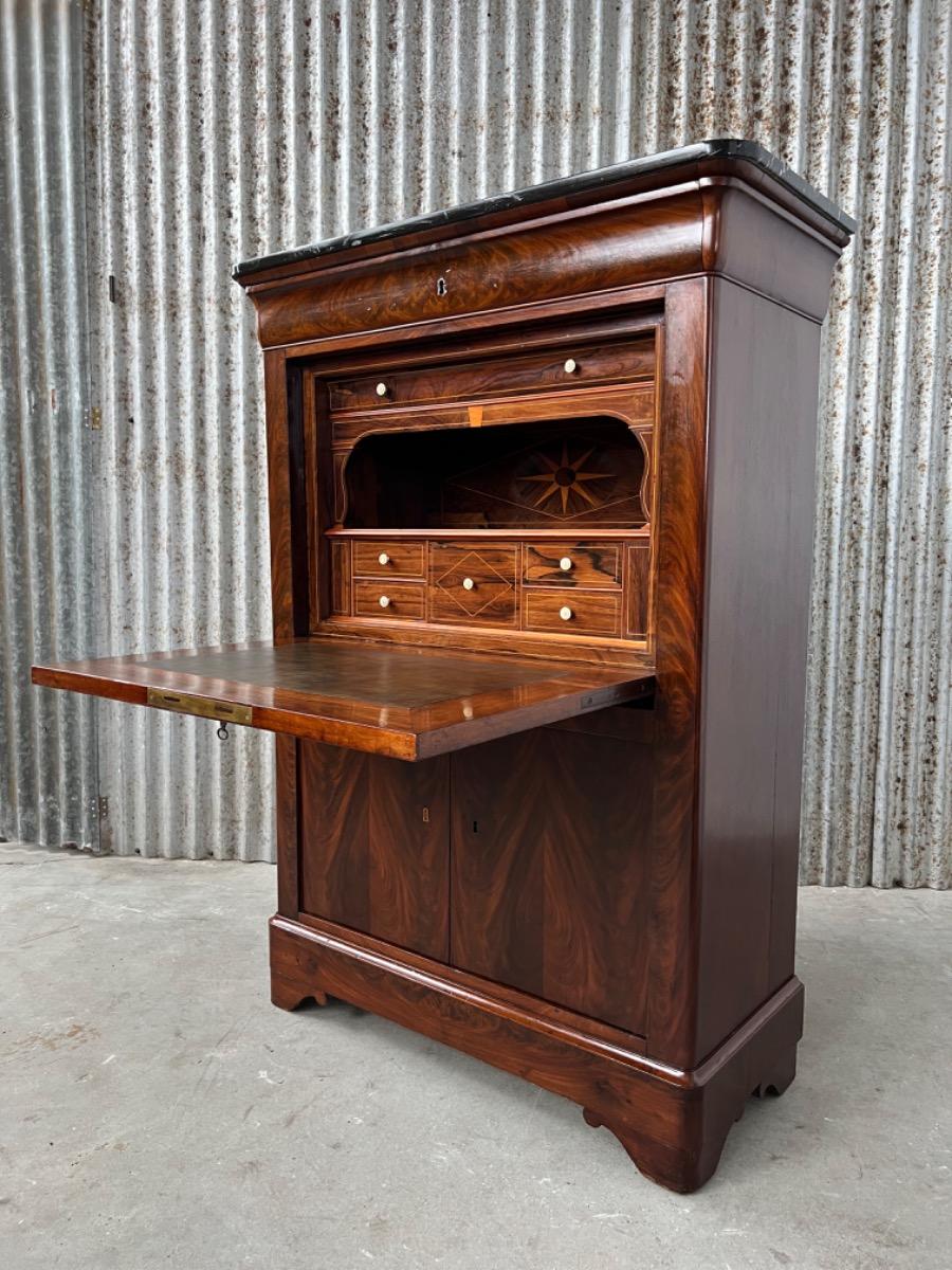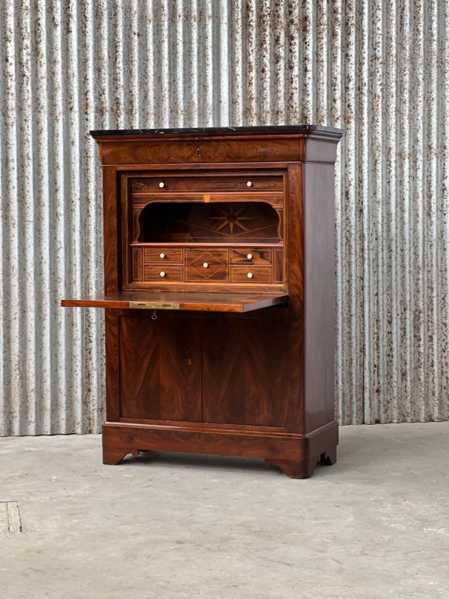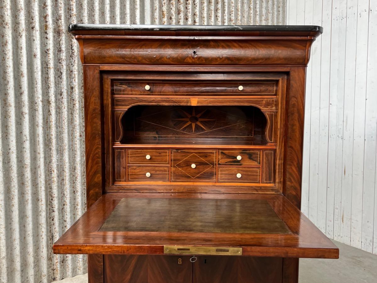 Mahonie klep secretaire gedekt met antraciet wit geaderd marmer. Zeer fraai boek Cuba bloem mahonie van buiten en palissander van binnen gefineerd. Het interieur vol met laden, waarvan 2 geheime laden èn 2 verborgen laden in de ‘kelder’. Zeer sierlijk en fraai in detail ingelegd met ‘boxwood’ sterren. Strak model, voor èn achter op breacket poot. Oorspronkelijke Sloten, en sleutel aanwezig en werkend. 2 deurs onderkast eveneens met werkend slot. Klep ingelegd met olijf groen kalfsleder. Mooie kwaliteit, goede staat. Frankrijk / Belgie omstreeks 1820 - 1840. Afm: H= 148 cm. B= 94 - 106 cm. (smalst- breedst) D= 41 - 46 cm. (diep - diepst) Onlangs grondig nagelopen op losse delen van constructie en fineer. Houtworm controle; Geen levende houtworm aangetroffen op 5/5/2023 Sec-2614~