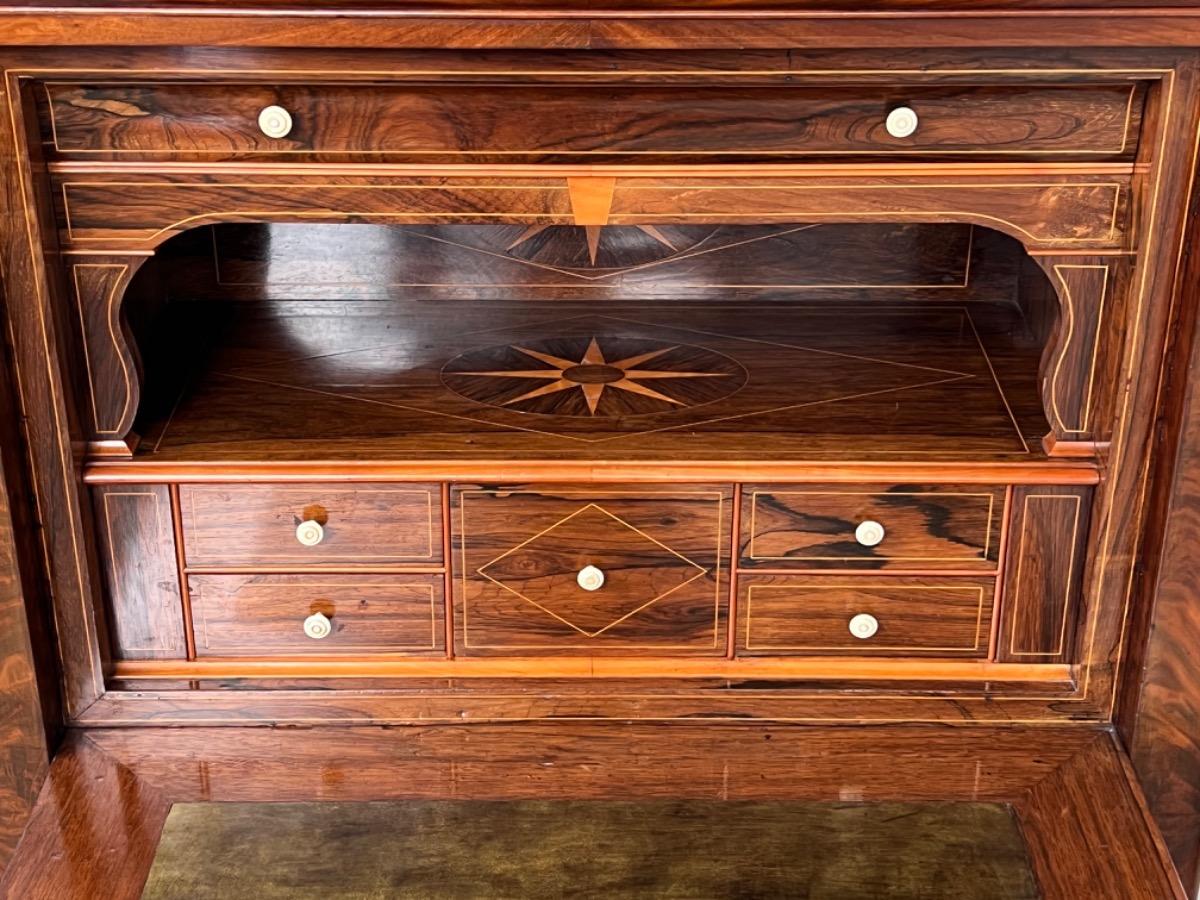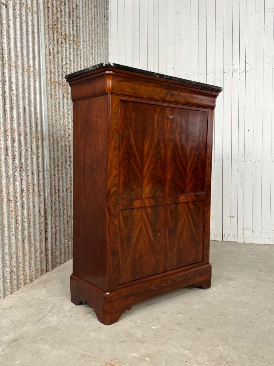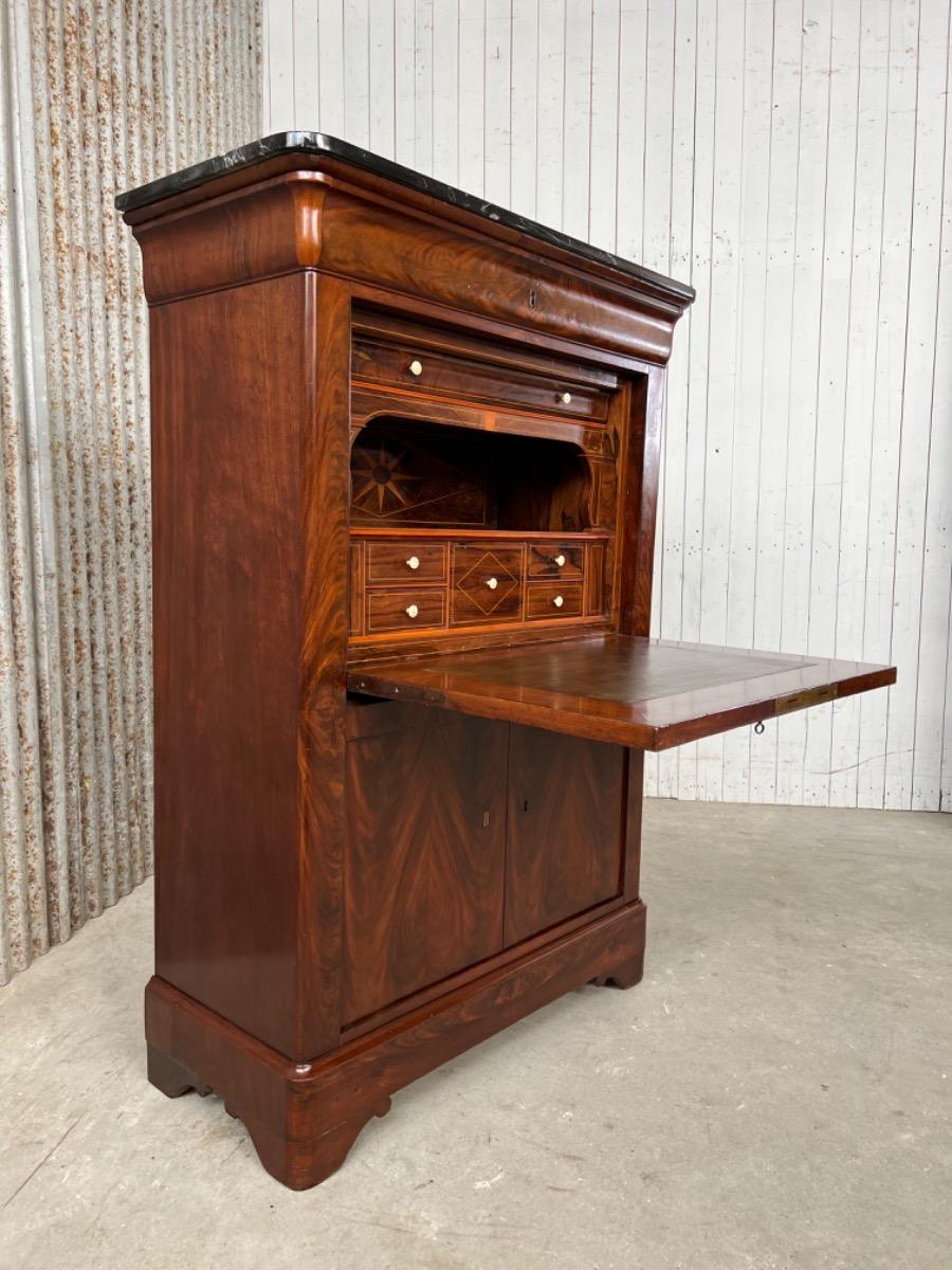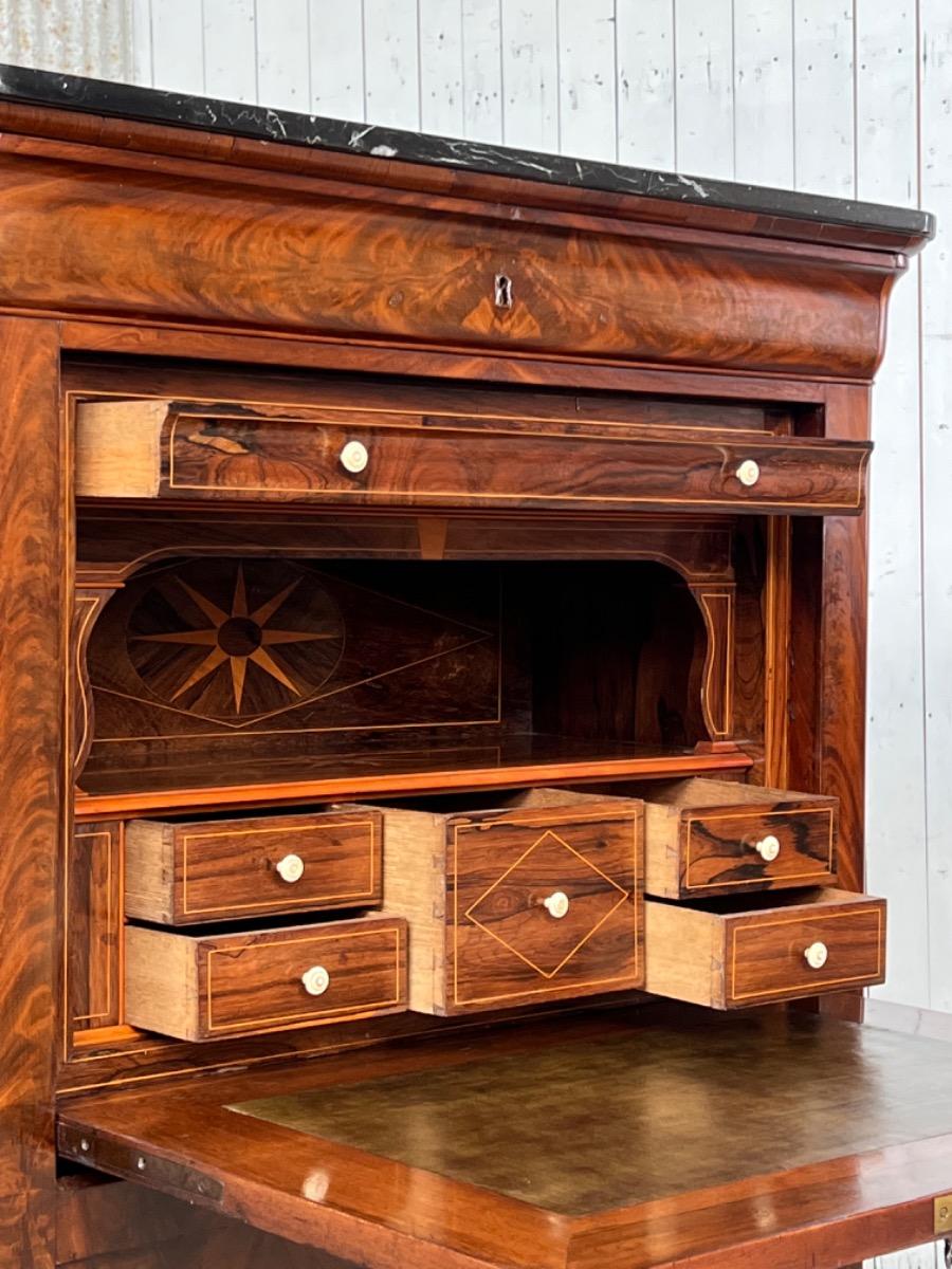 Mahonie klep secretaire gedekt met antraciet wit geaderd marmer. Zeer fraai boek Cuba bloem mahonie van buiten en palissander van binnen gefineerd. Het interieur vol met laden, waarvan 2 geheime laden èn 2 verborgen laden in de ‘kelder’. Zeer sierlijk en fraai in detail ingelegd met ‘boxwood’ sterren. Strak model, voor èn achter op breacket poot. Oorspronkelijke Sloten, en sleutel aanwezig en werkend. 2 deurs onderkast eveneens met werkend slot. Klep ingelegd met olijf groen kalfsleder. Mooie kwaliteit, goede staat. Frankrijk / Belgie omstreeks 1820 - 1840. Afm: H= 148 cm. B= 94 - 106 cm. (smalst- breedst) D= 41 - 46 cm. (diep - diepst) Onlangs grondig nagelopen op losse delen van constructie en fineer. Houtworm controle; Geen levende houtworm aangetroffen op 5/5/2023 Sec-2614~