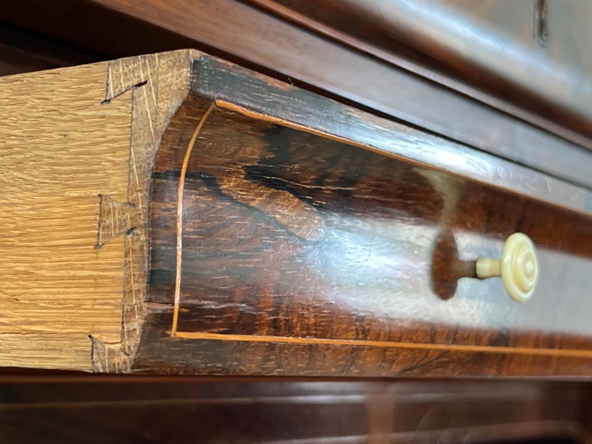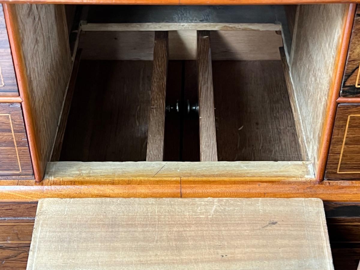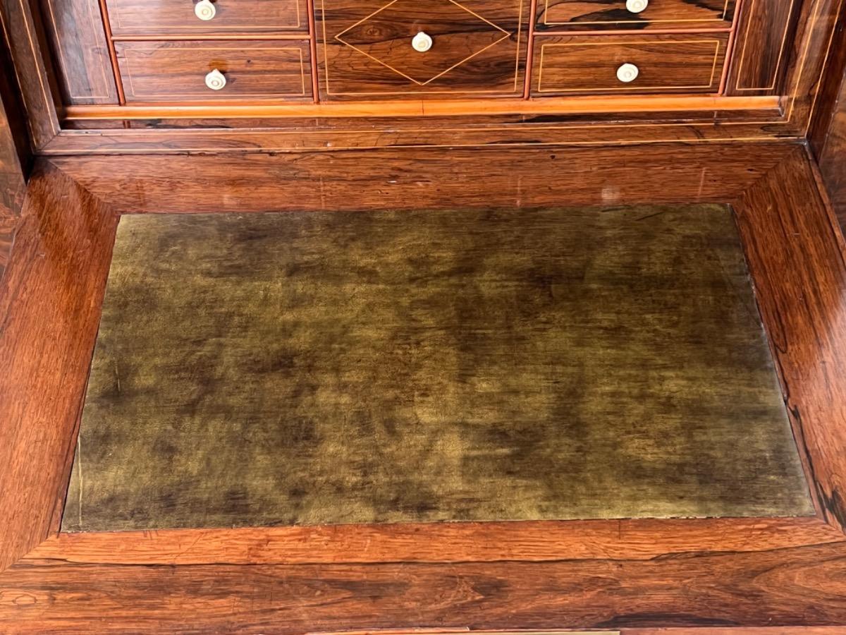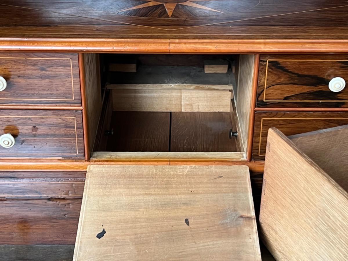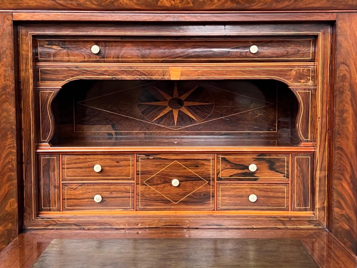 Mahonie klep secretaire gedekt met antraciet wit geaderd marmer. Zeer fraai boek Cuba bloem mahonie van buiten en palissander van binnen gefineerd. Het interieur vol met laden, waarvan 2 geheime laden èn 2 verborgen laden in de ‘kelder’. Zeer sierlijk en fraai in detail ingelegd met ‘boxwood’ sterren. Strak model, voor èn achter op breacket poot. Oorspronkelijke Sloten, en sleutel aanwezig en werkend. 2 deurs onderkast eveneens met werkend slot. Klep ingelegd met olijf groen kalfsleder. Mooie kwaliteit, goede staat. Frankrijk / Belgie omstreeks 1820 - 1840. Afm: H= 148 cm. B= 94 - 106 cm. (smalst- breedst) D= 41 - 46 cm. (diep - diepst) Onlangs grondig nagelopen op losse delen van constructie en fineer. Houtworm controle; Geen levende houtworm aangetroffen op 5/5/2023 Sec-2614~