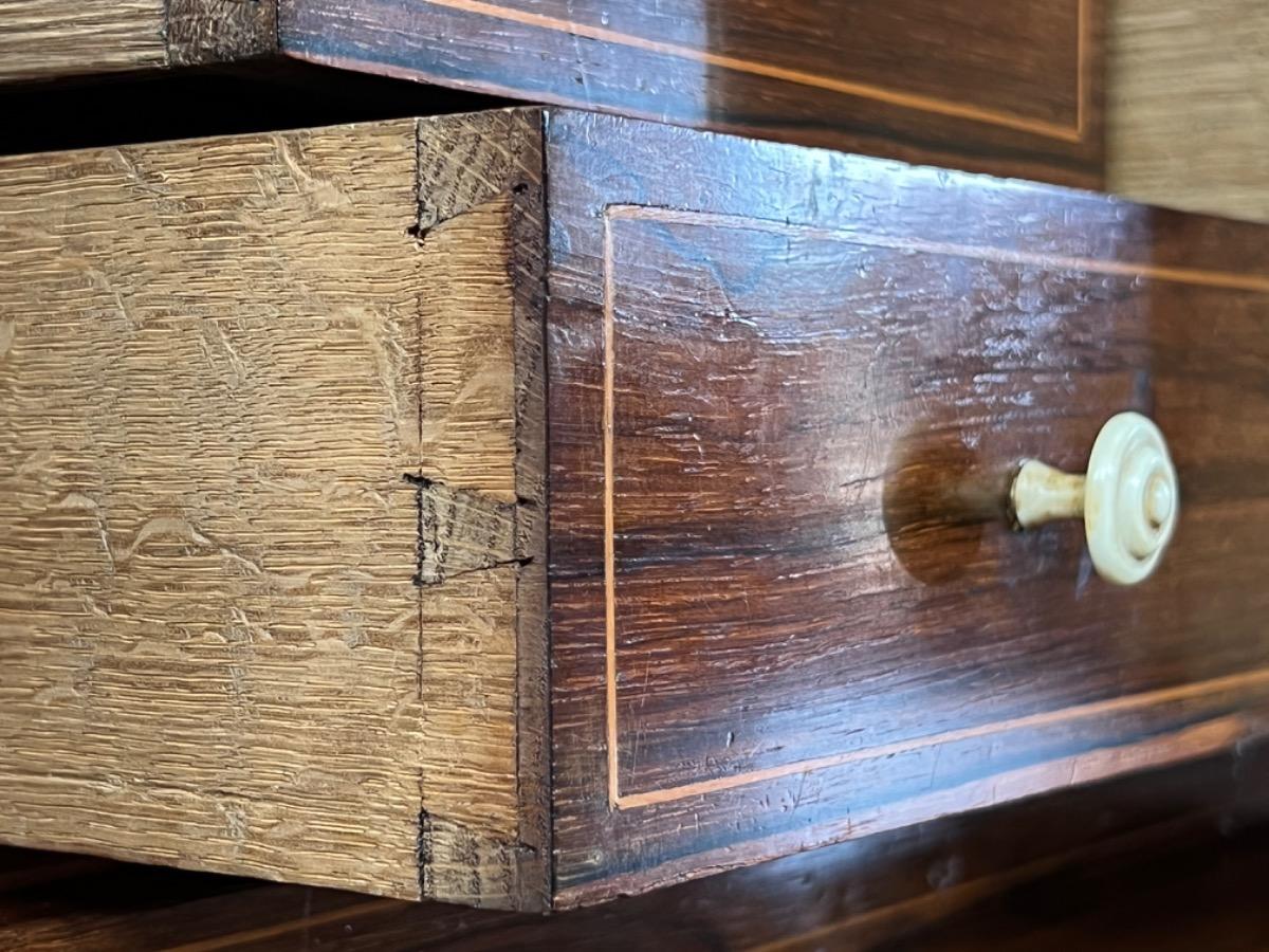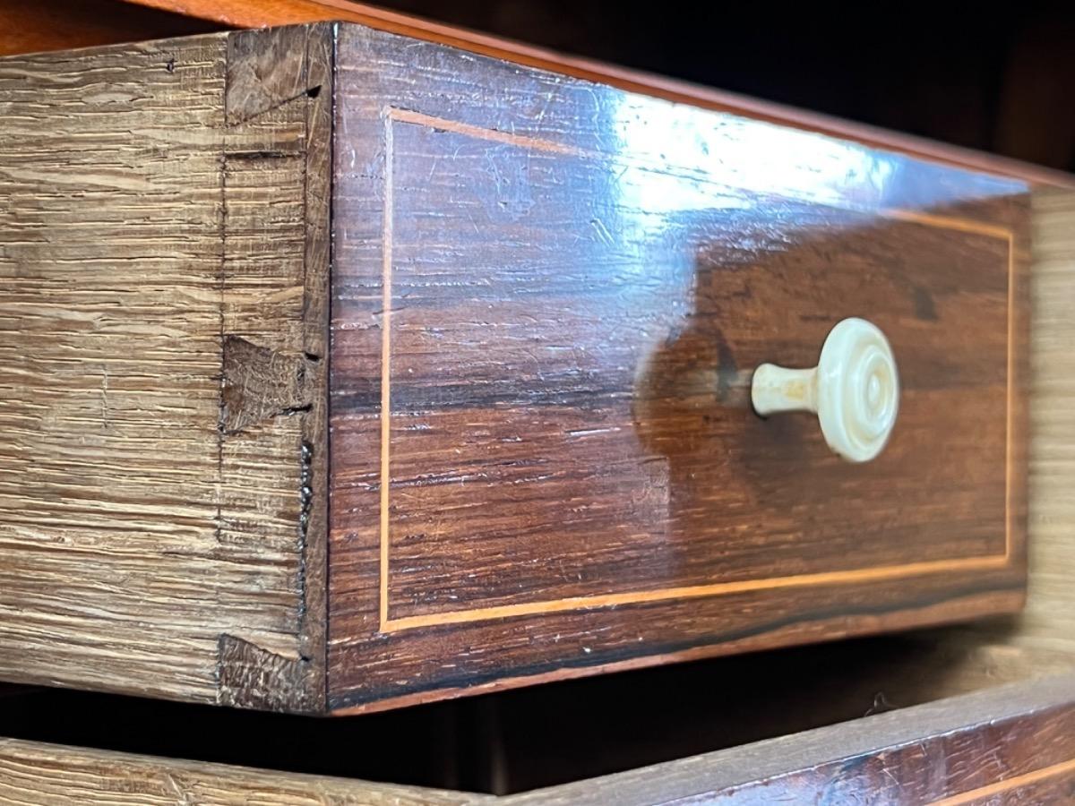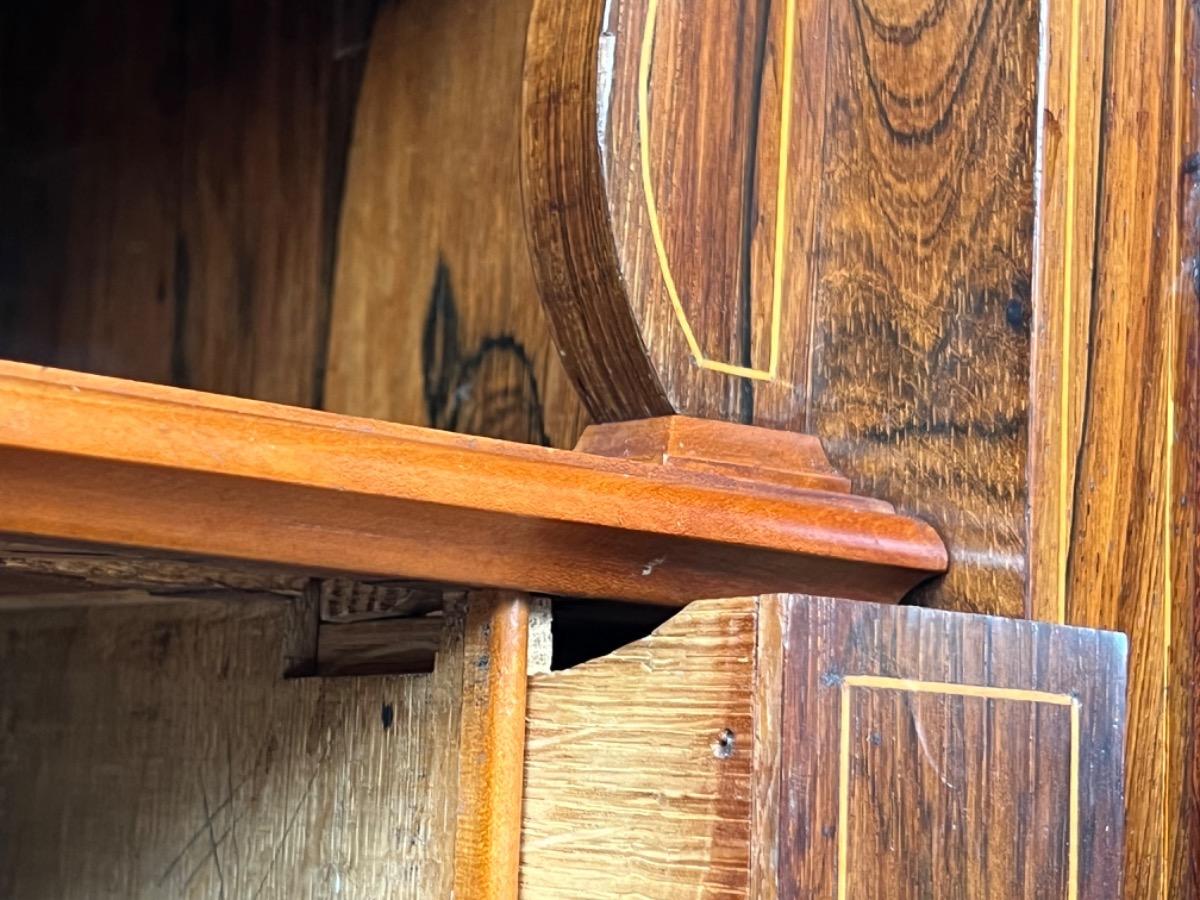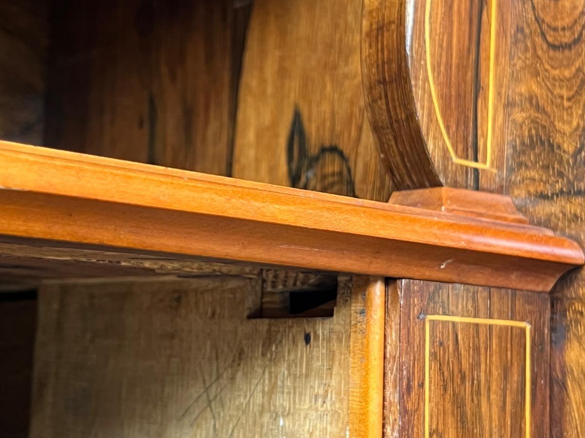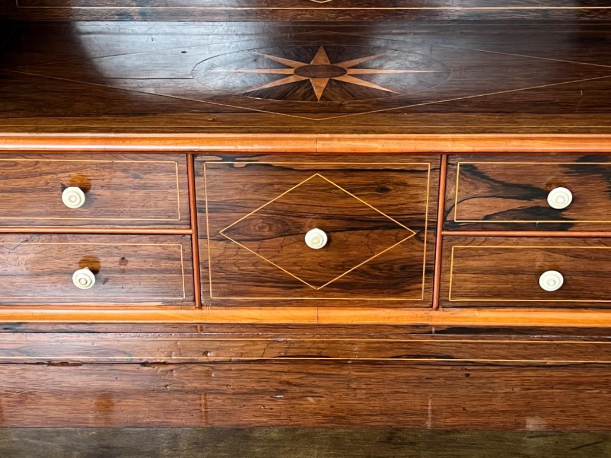 Mahonie klep secretaire gedekt met antraciet wit geaderd marmer. Zeer fraai boek Cuba bloem mahonie van buiten en palissander van binnen gefineerd. Het interieur vol met laden, waarvan 2 geheime laden èn 2 verborgen laden in de ‘kelder’. Zeer sierlijk en fraai in detail ingelegd met ‘boxwood’ sterren. Strak model, voor èn achter op breacket poot. Oorspronkelijke Sloten, en sleutel aanwezig en werkend. 2 deurs onderkast eveneens met werkend slot. Klep ingelegd met olijf groen kalfsleder. Mooie kwaliteit, goede staat. Frankrijk / Belgie omstreeks 1820 - 1840. Afm: H= 148 cm. B= 94 - 106 cm. (smalst- breedst) D= 41 - 46 cm. (diep - diepst) Onlangs grondig nagelopen op losse delen van constructie en fineer. Houtworm controle; Geen levende houtworm aangetroffen op 5/5/2023 Sec-2614~