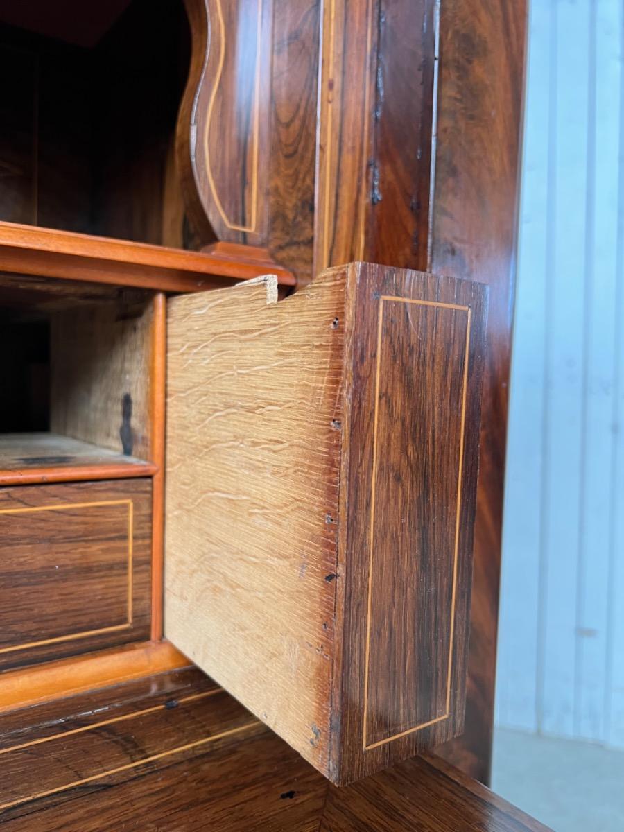 Mahonie klep secretaire gedekt met antraciet wit geaderd marmer.
