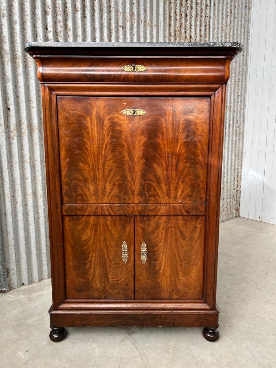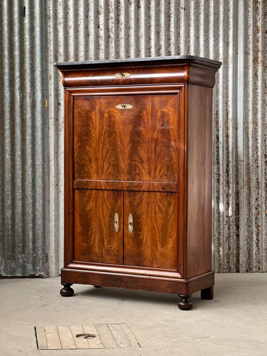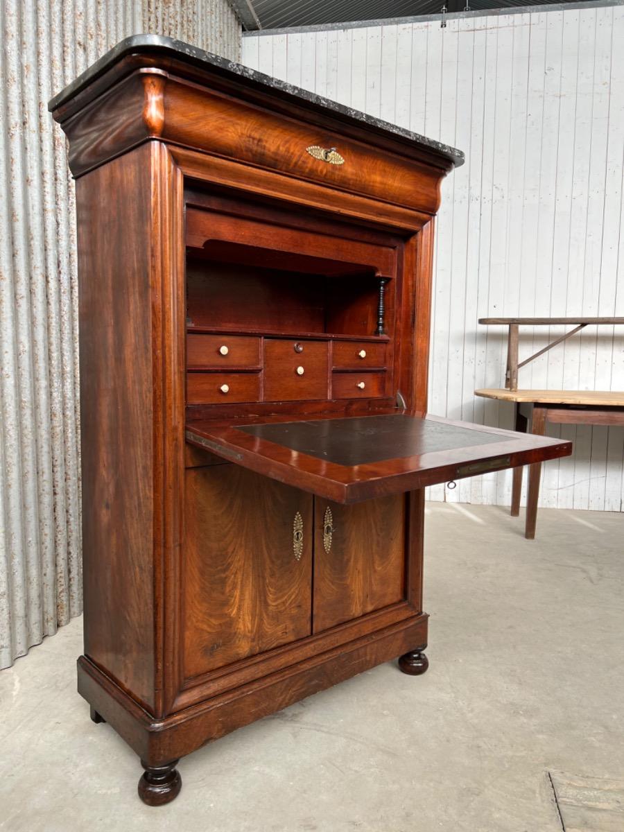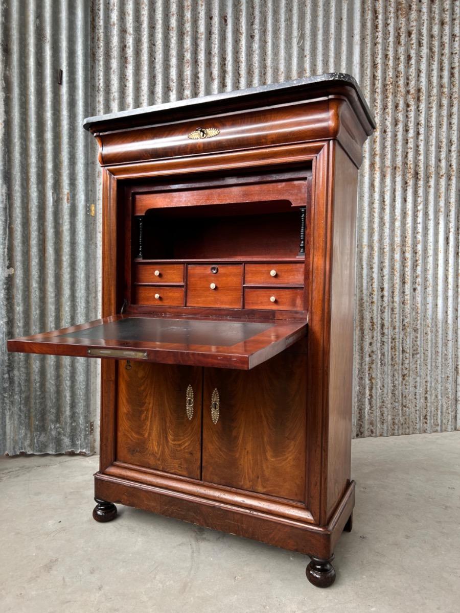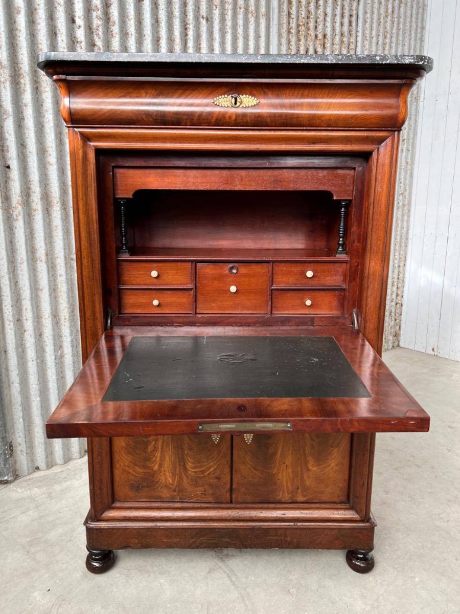 Mahonie secretaire gedekt met St. Anna marmer. (Niet gebroken of gebroken geweest) Zeer fraai doorlopend èn gespiegeld boek Cuba bloem mahonie Gefineerd. Het interieur vol met 5 laden met witte gedraaide knop. Strak model, vlakke deuren en klep, op massief mahonie gedraaide poot. Oorspronkelijke Sloten (3) en sleutels (3) aanwezig en werkend. (Slot mist van centrale lade in interieur) afgedekt met verguld messing entré beslag. Klep ingelegd met donker olijf groen zeildoek. Marmer is gekapt aan de achterzijde. Meubel verkeert in zeer goede en direct te gebruiken staat, voldoende kwaliteit aanwezig. Frankrijk omstreeks 1830. Afm: H= 152 cm. B= 90 - 101 cm. D= 39 - 47 cm. Onlangs grondig nagelopen op losse delen van constructie en fineer. Houtworm controle : Geen levende houtworm aangetroffen op 10/3/2022 Sec-2401~