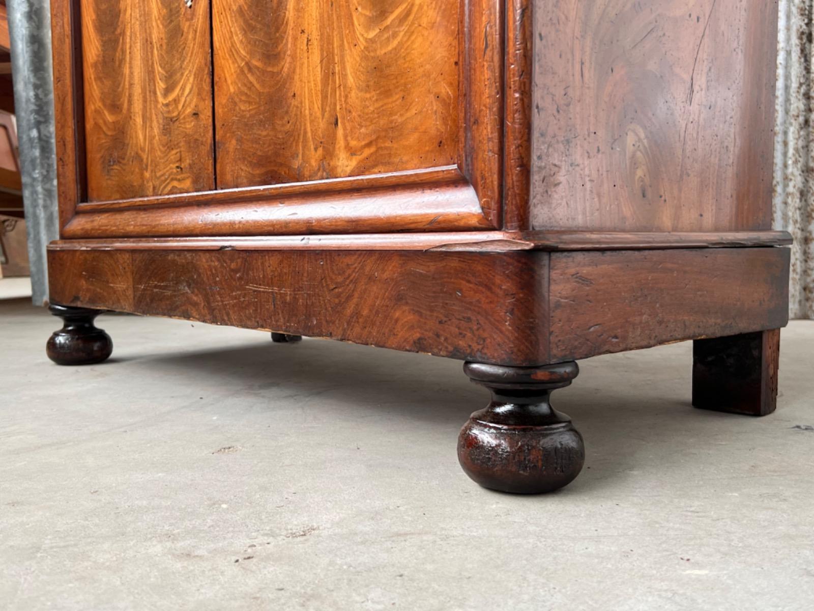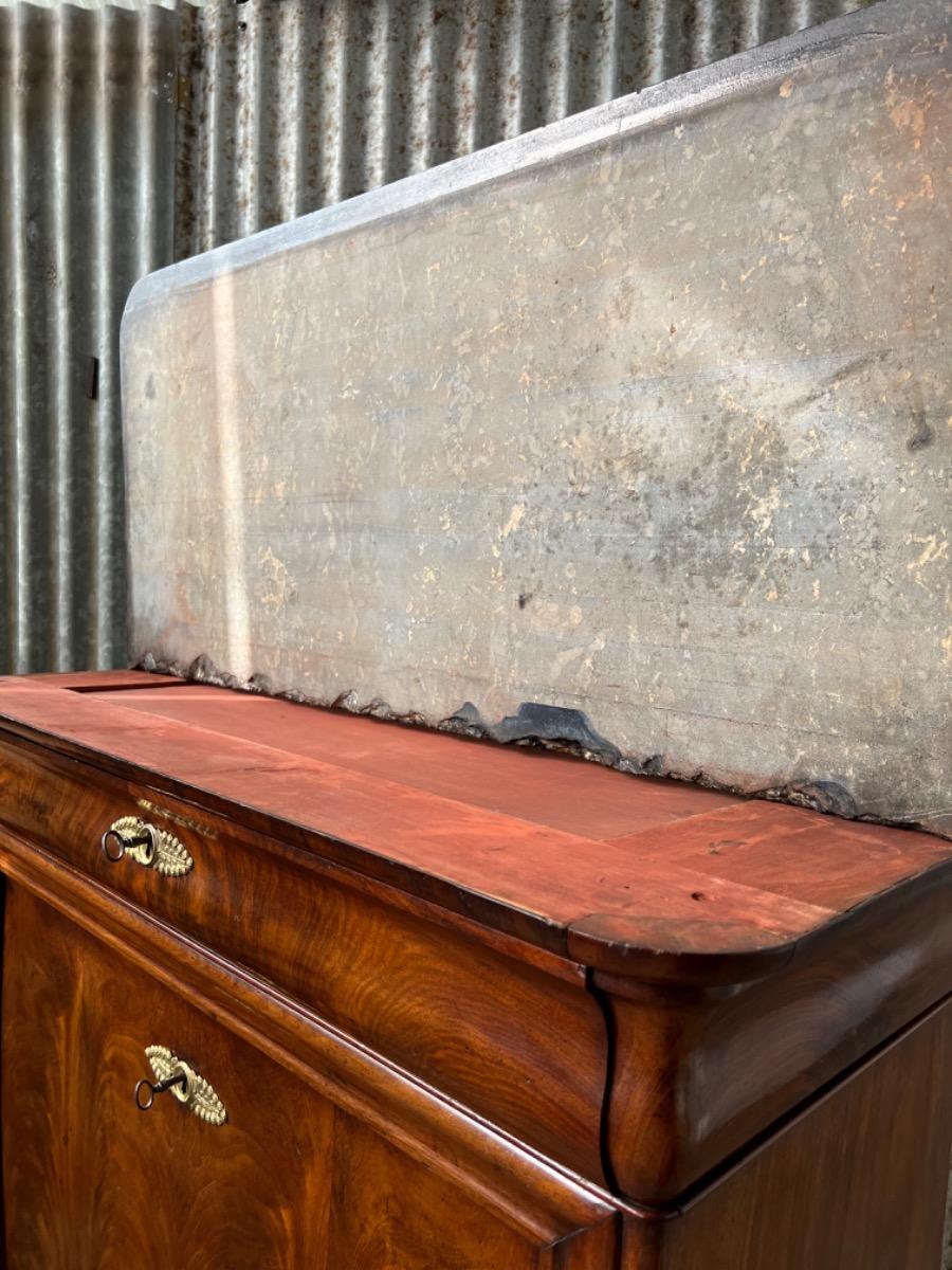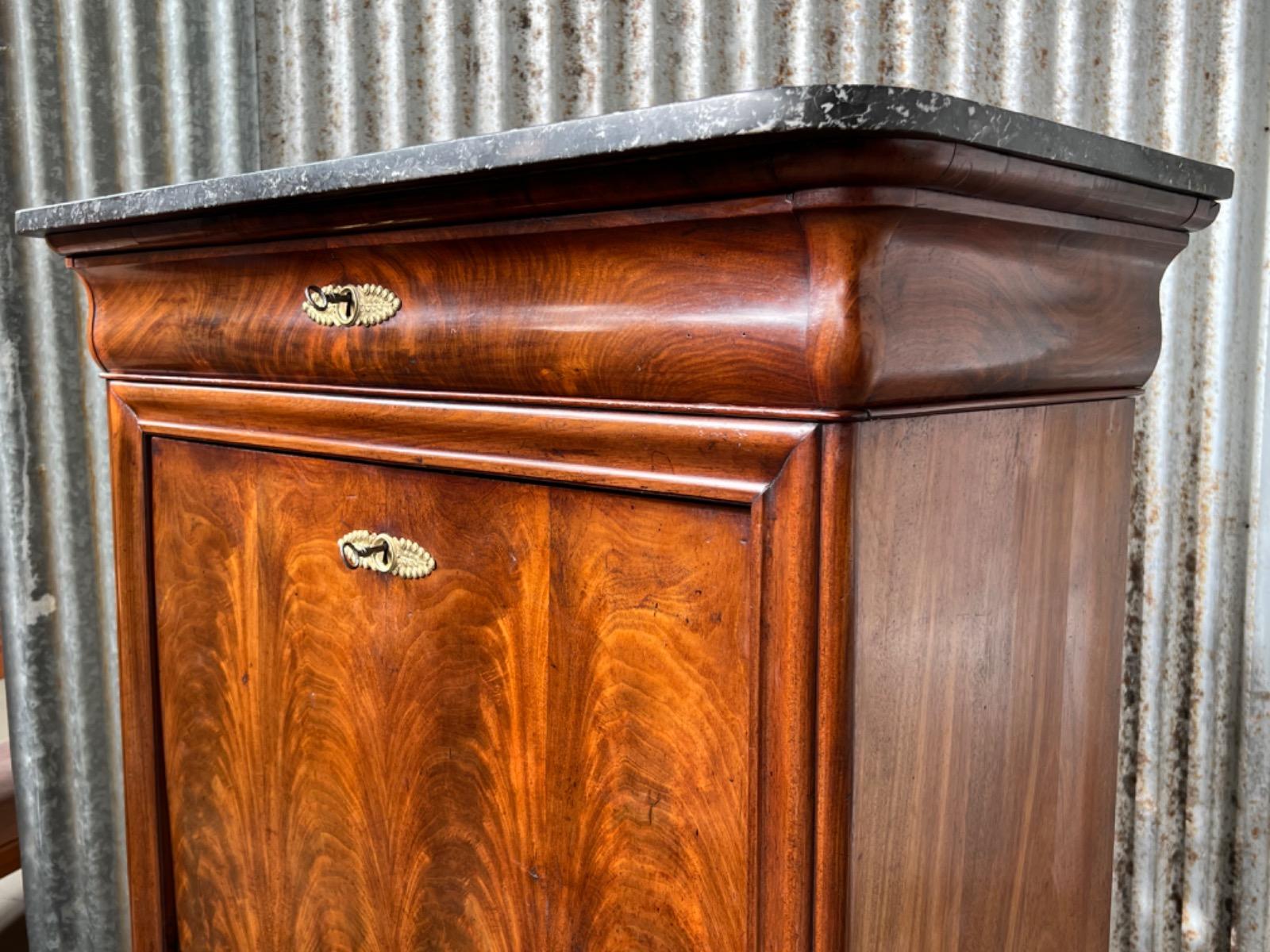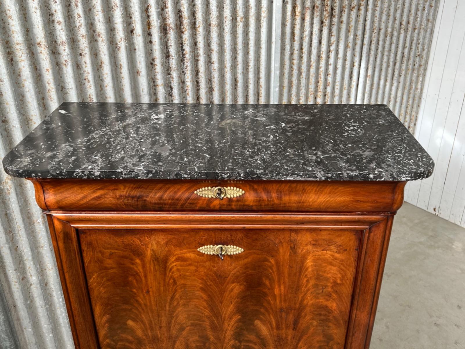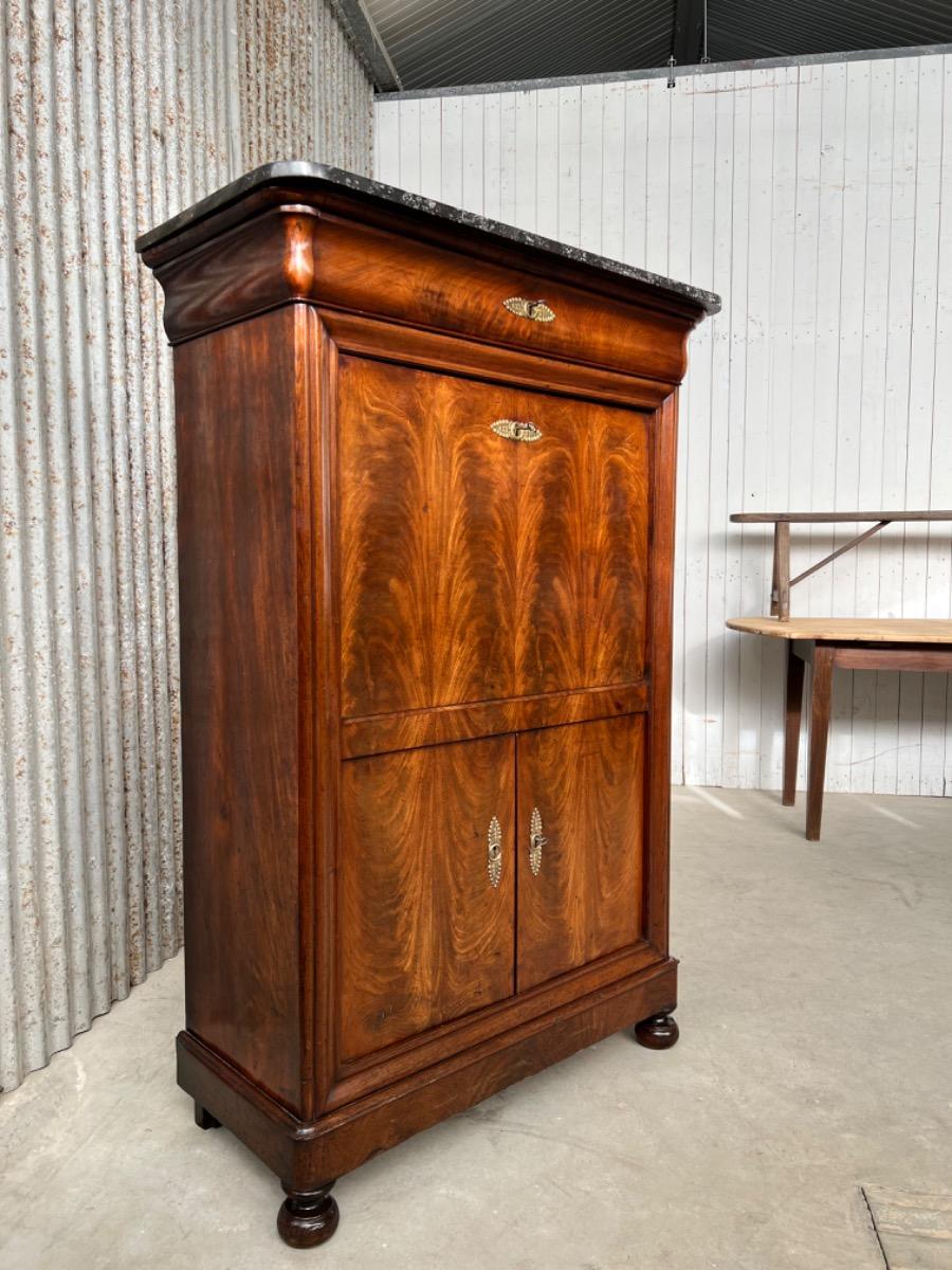Mahonie secretaire gedekt met St. Anna marmer. (Niet gebroken of gebroken geweest) Zeer fraai doorlopend èn gespiegeld boek Cuba bloem mahonie Gefineerd. Het interieur vol met 5 laden met witte gedraaide knop. Strak model, vlakke deuren en klep, op massief mahonie gedraaide poot. Oorspronkelijke Sloten (3) en sleutels (3) aanwezig en werkend. (Slot mist van centrale lade in interieur) afgedekt met verguld messing entré beslag. Klep ingelegd met donker olijf groen zeildoek. Marmer is gekapt aan de achterzijde. Meubel verkeert in zeer goede en direct te gebruiken staat, voldoende kwaliteit aanwezig. Frankrijk omstreeks 1830. Afm: H= 152 cm. B= 90 - 101 cm. D= 39 - 47 cm. Onlangs grondig nagelopen op losse delen van constructie en fineer. Houtworm controle : Geen levende houtworm aangetroffen op 10/3/2022 Sec-2401~