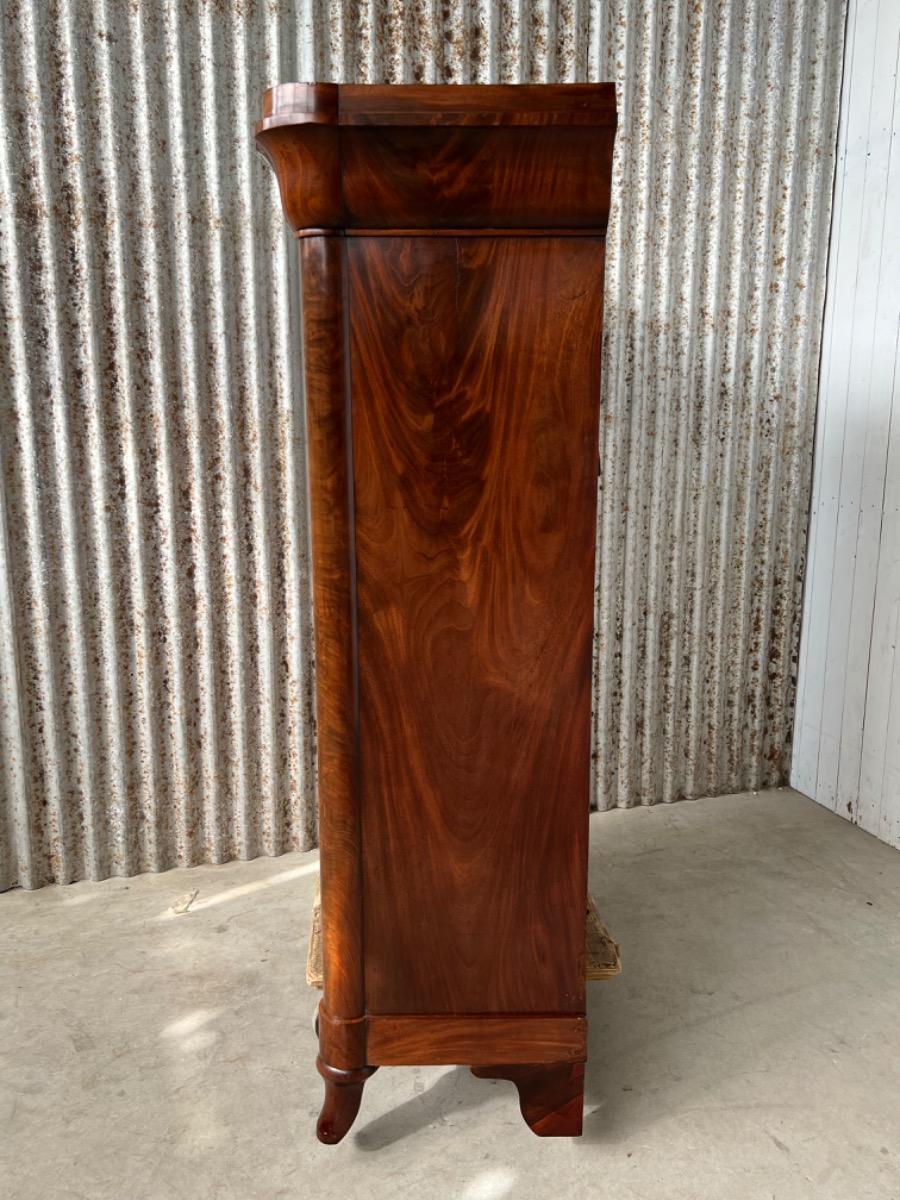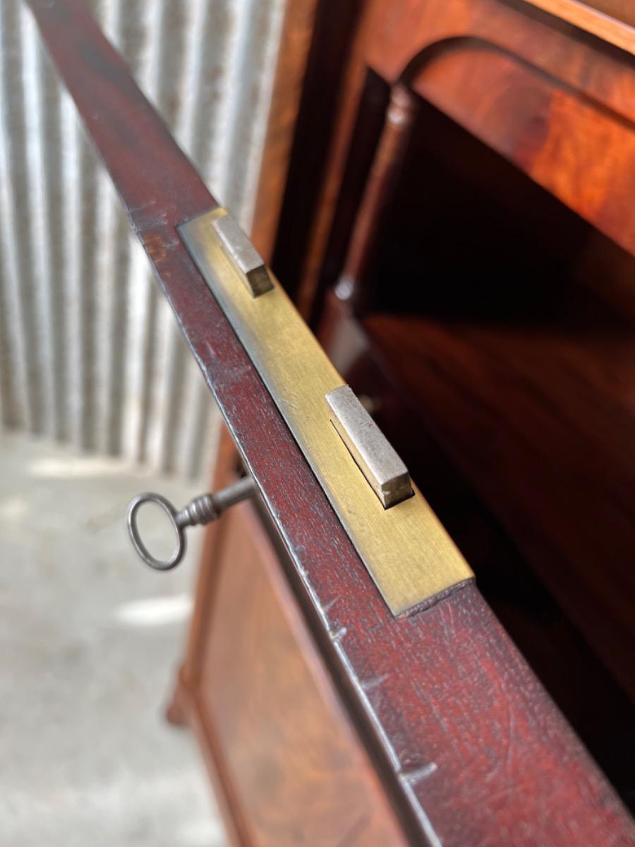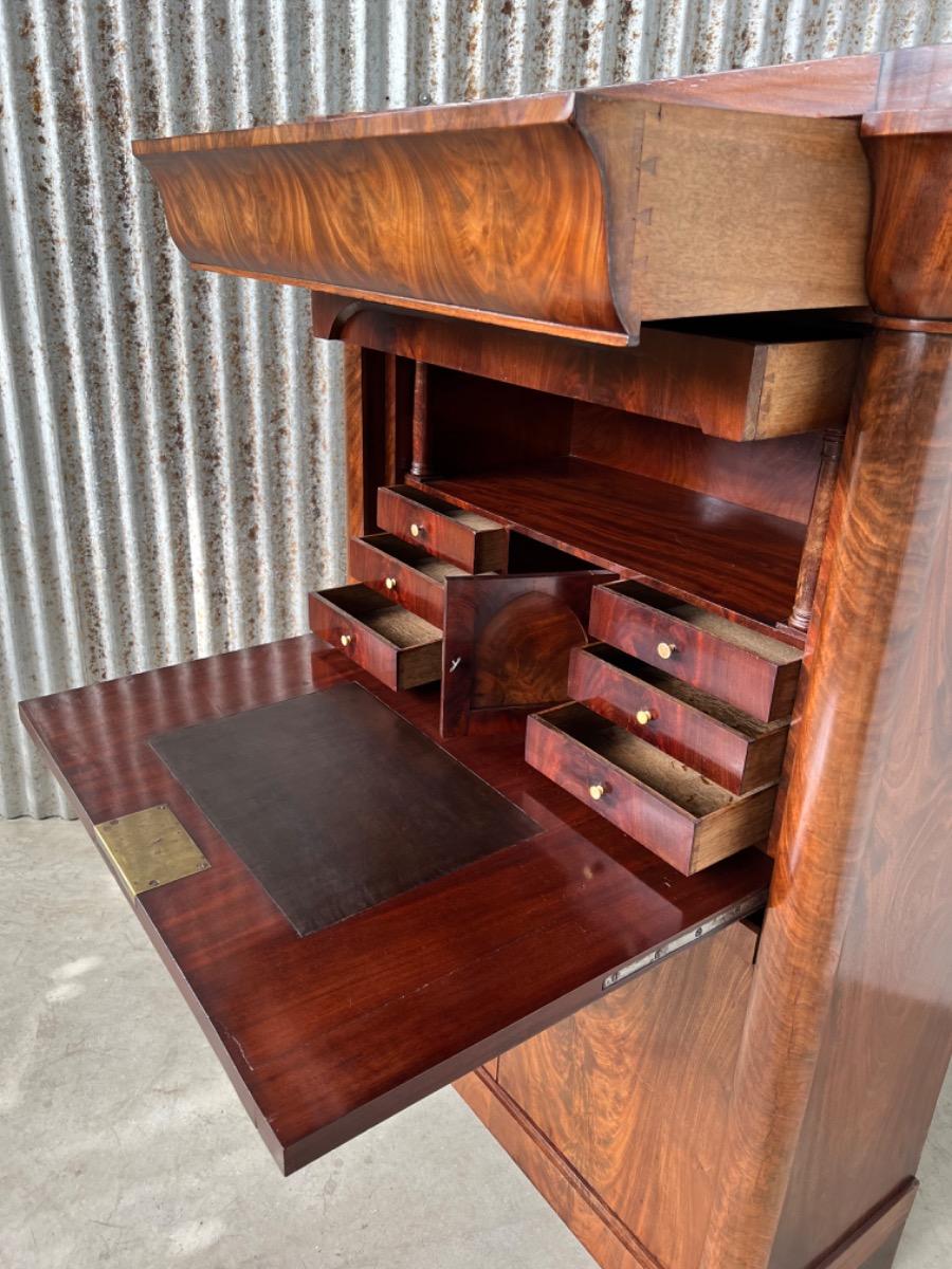 Mahonie secretaire strak model, zeer fraai bloemmahonie gefineerd met massief messing entreé's 6 laden in het interieur met ivoren knopjes en aan weerskanten volle pilaren. 1 blinde lade in de kap. Sloten (in klep met bel) en sleutels oorspronkelijk èn werkend. Klep ingelegd is ingelegd met "olijf groen" kalfsleder, geen scheuren in de klep. Hollands, omstreeks 1820. Afm: H= 160cm. B= 104 cm. D= 40 - 47 cm. Onlangs grondig nagelopen op losse delen van constructie en fineer. Houtworm controle : Geen levende houtworm aangetroffen op 23/3/2022 sec-2334~