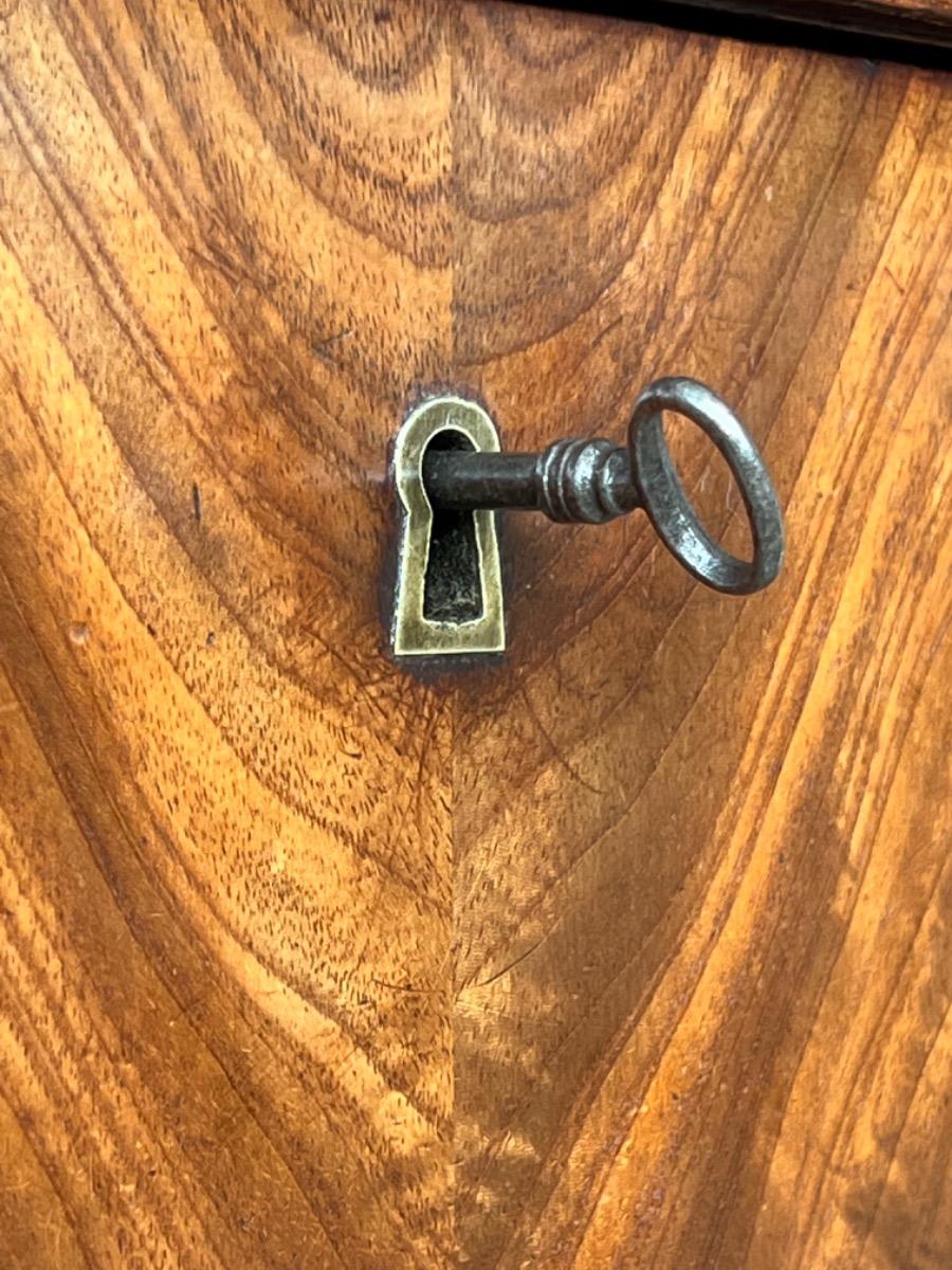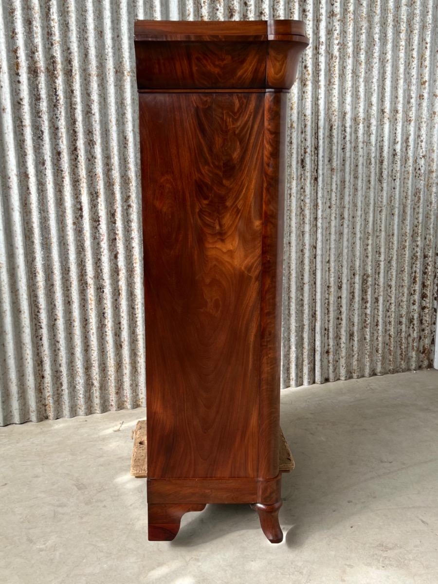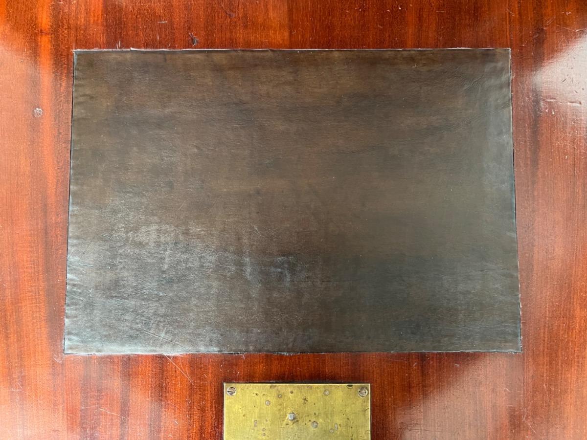 Mahonie secretaire strak model, zeer fraai bloemmahonie gefineerd met massief messing entreé's 6 laden in het interieur met ivoren knopjes en aan weerskanten volle pilaren. 1 blinde lade in de kap. Sloten (in klep met bel) en sleutels oorspronkelijk èn werkend. Klep ingelegd is ingelegd met "olijf groen" kalfsleder, geen scheuren in de klep. Hollands, omstreeks 1820. Afm: H= 160cm. B= 104 cm. D= 40 - 47 cm. Onlangs grondig nagelopen op losse delen van constructie en fineer. Houtworm controle : Geen levende houtworm aangetroffen op 23/3/2022 sec-2334~