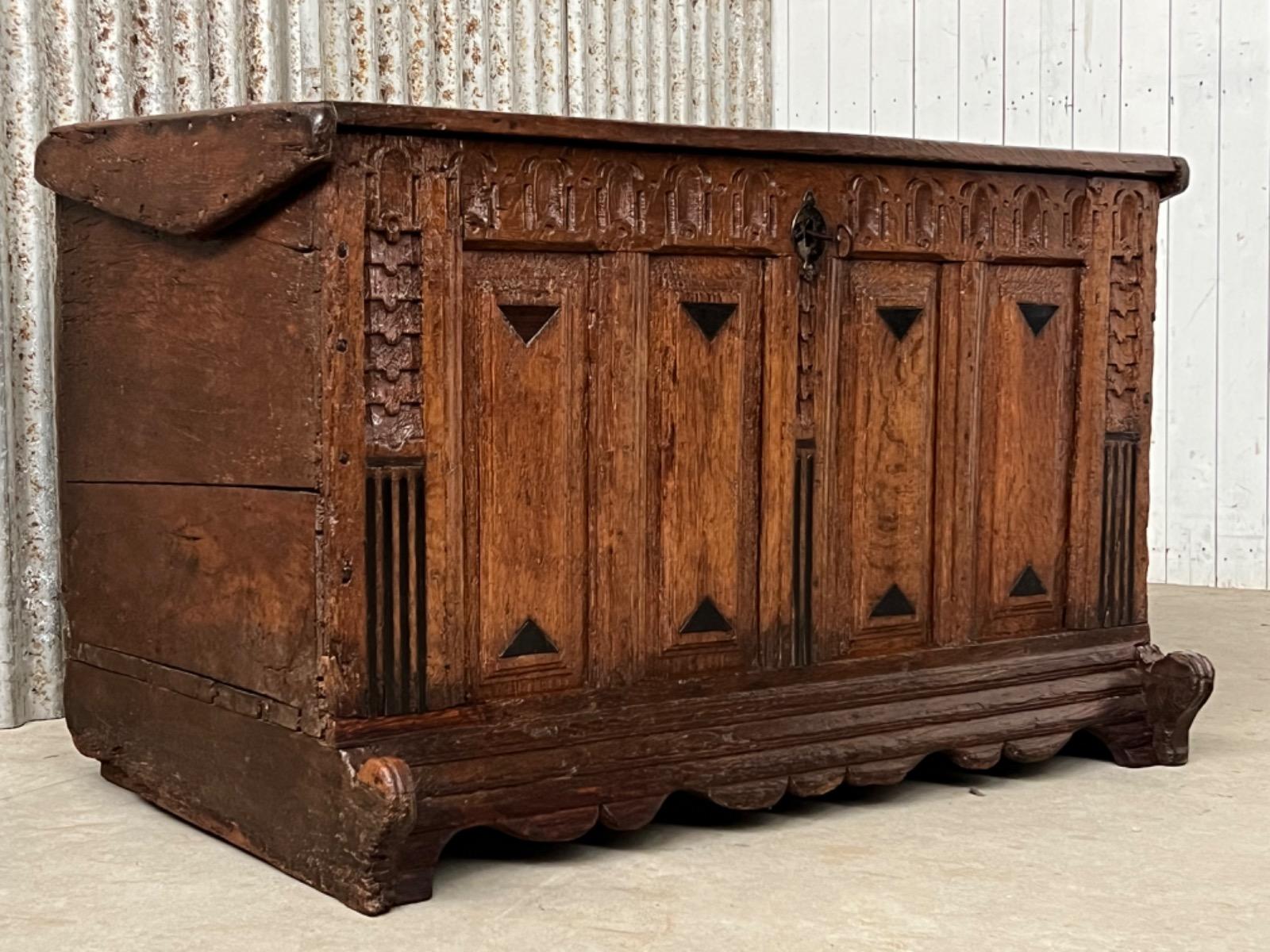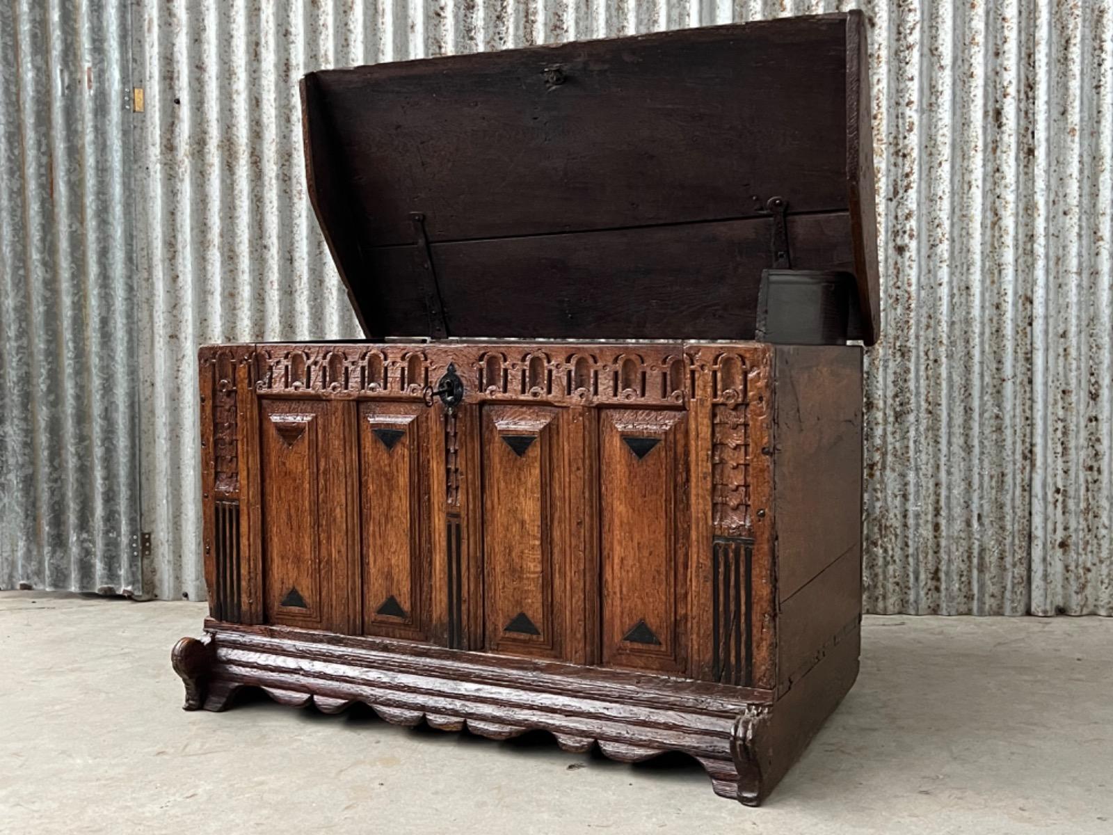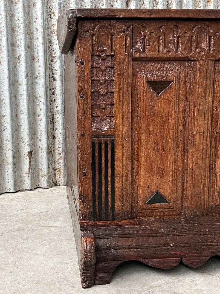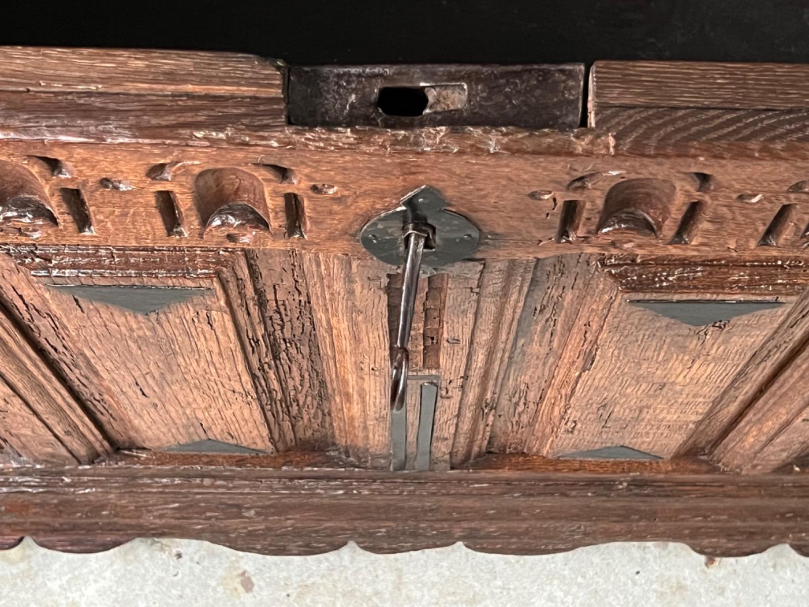 Een prachtige en zeldzame vroege 17e-eeuwse eikenhouten kist van kleine afmetingen en prachtige kleur, glans én patina.