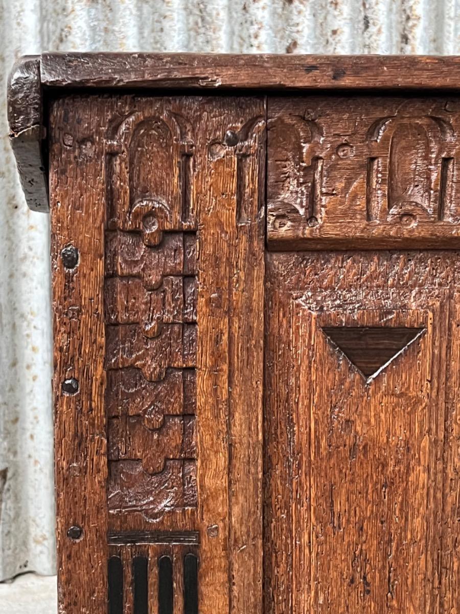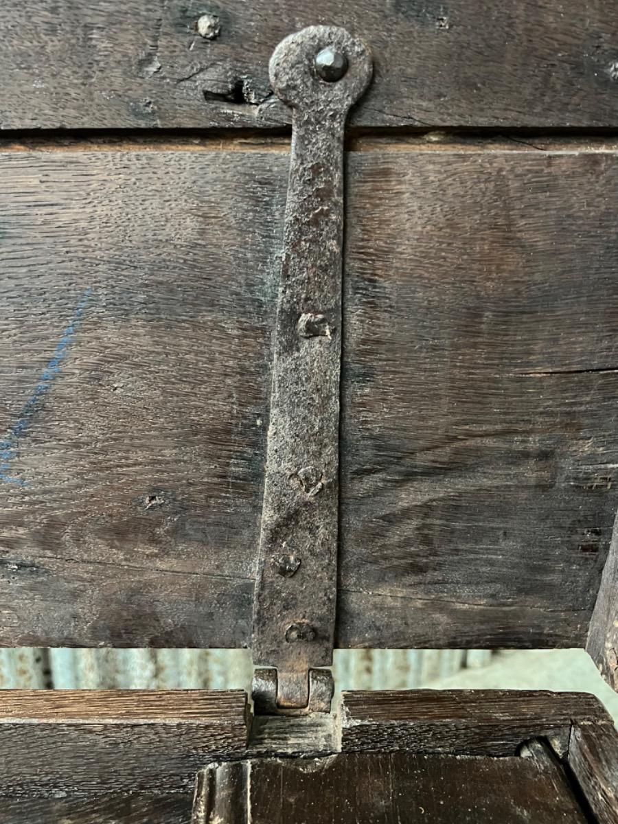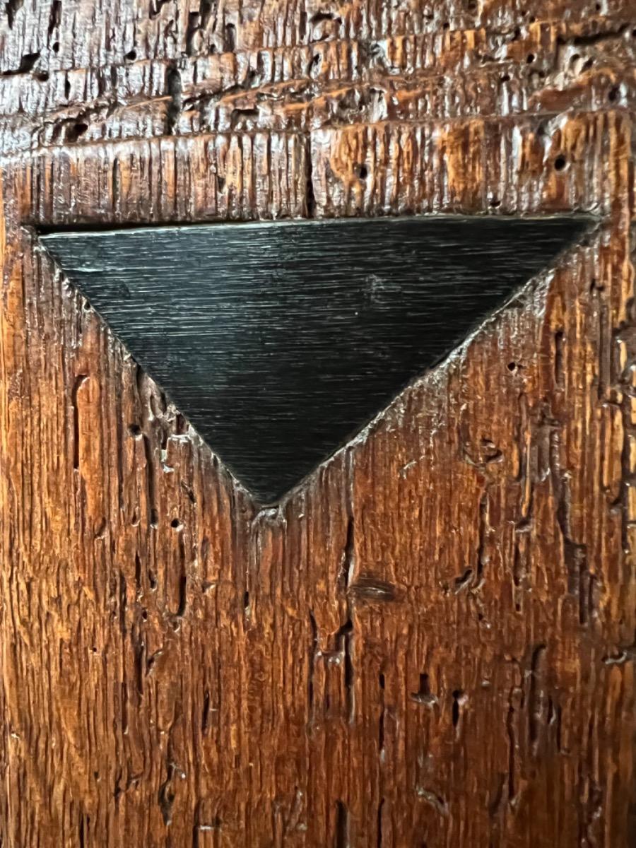 Gemaakt van enkele eikenhouten planken en panelen. Geen zwaluwstaarten maar houten pennen. Oorspronkelijk zwart hout ingelegd.