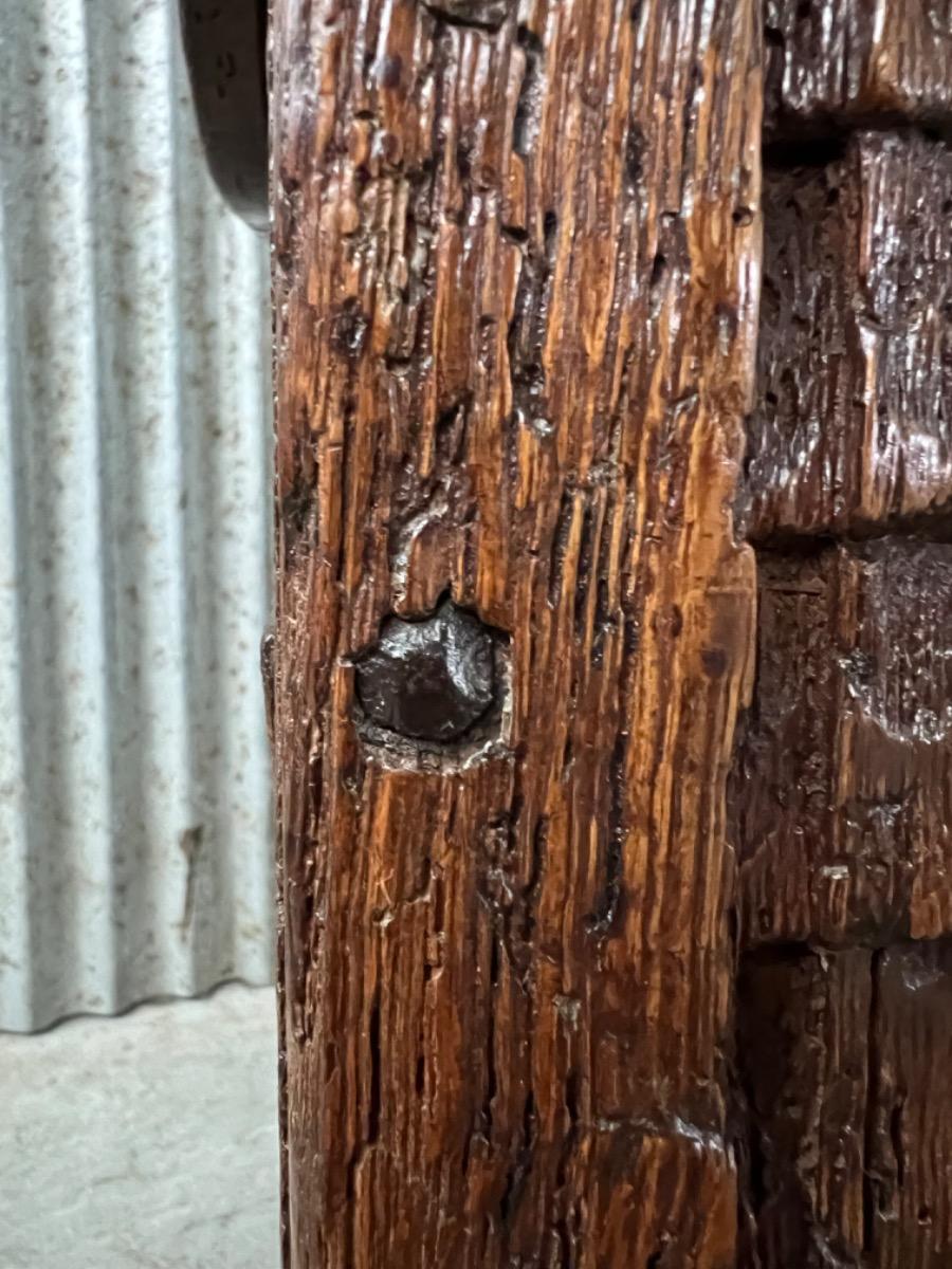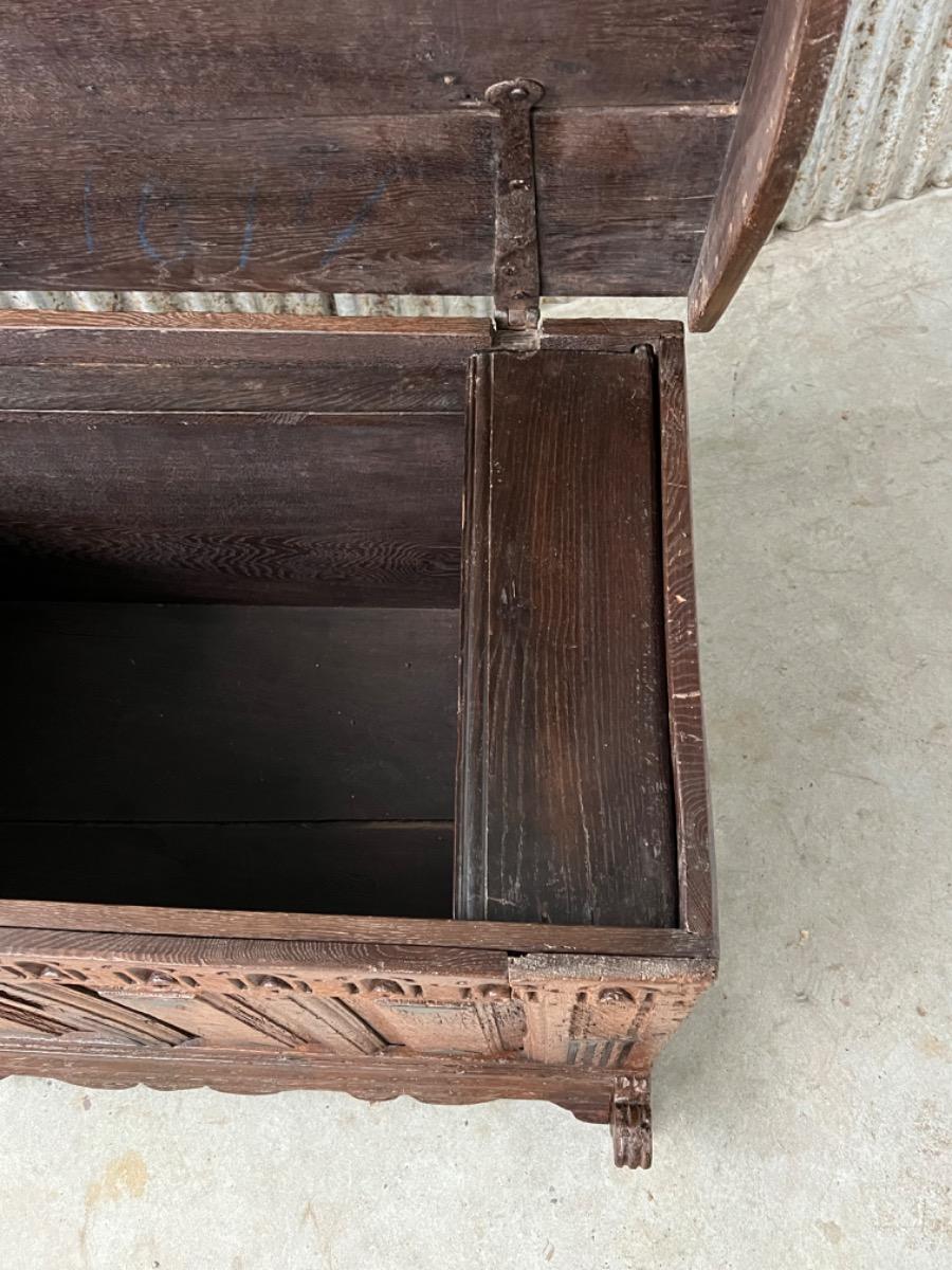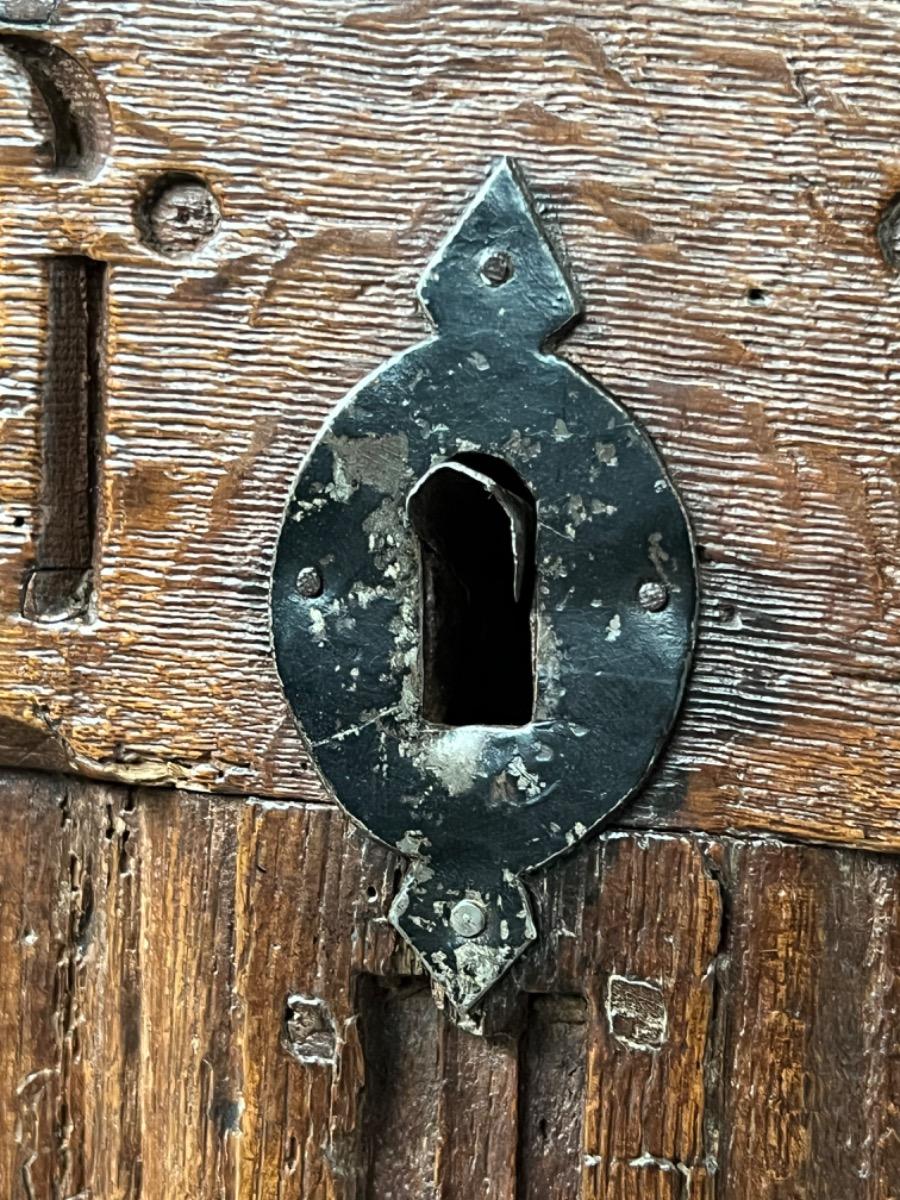 Gemaakt van enkele eikenhouten planken en panelen. Geen zwaluwstaarten maar houten pennen. Oorspronkelijk zwart hout ingelegd.