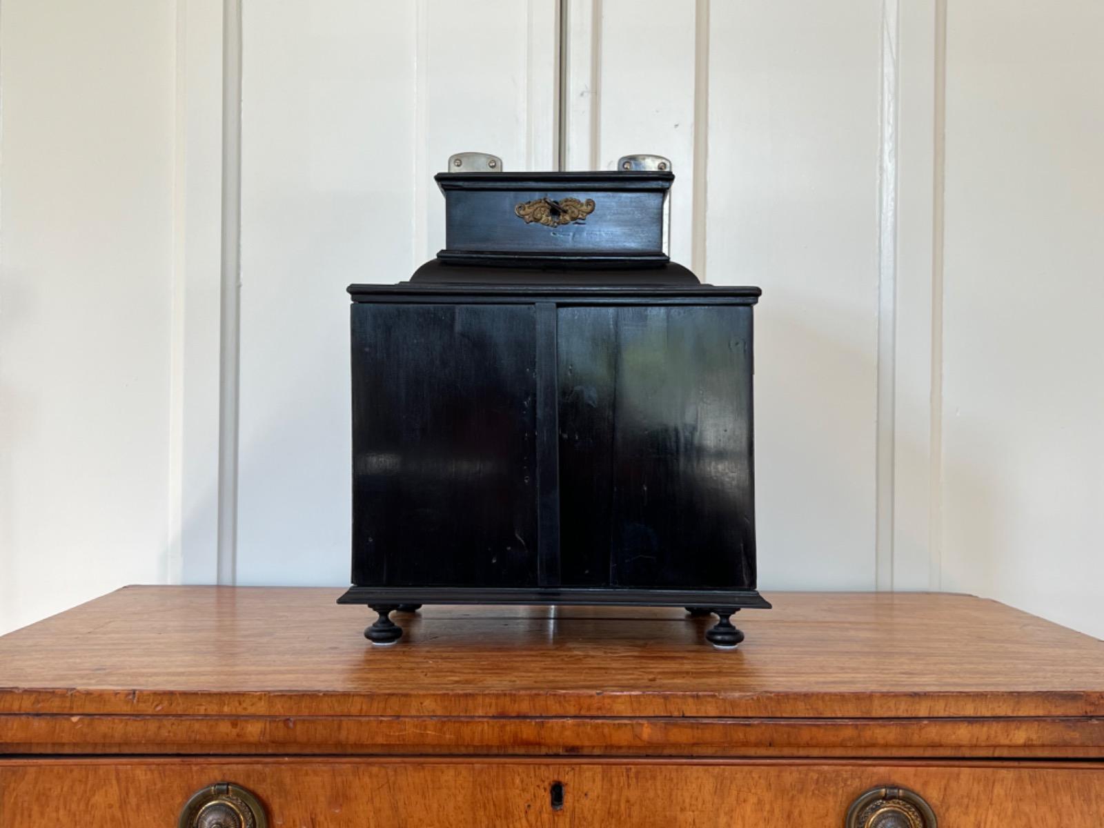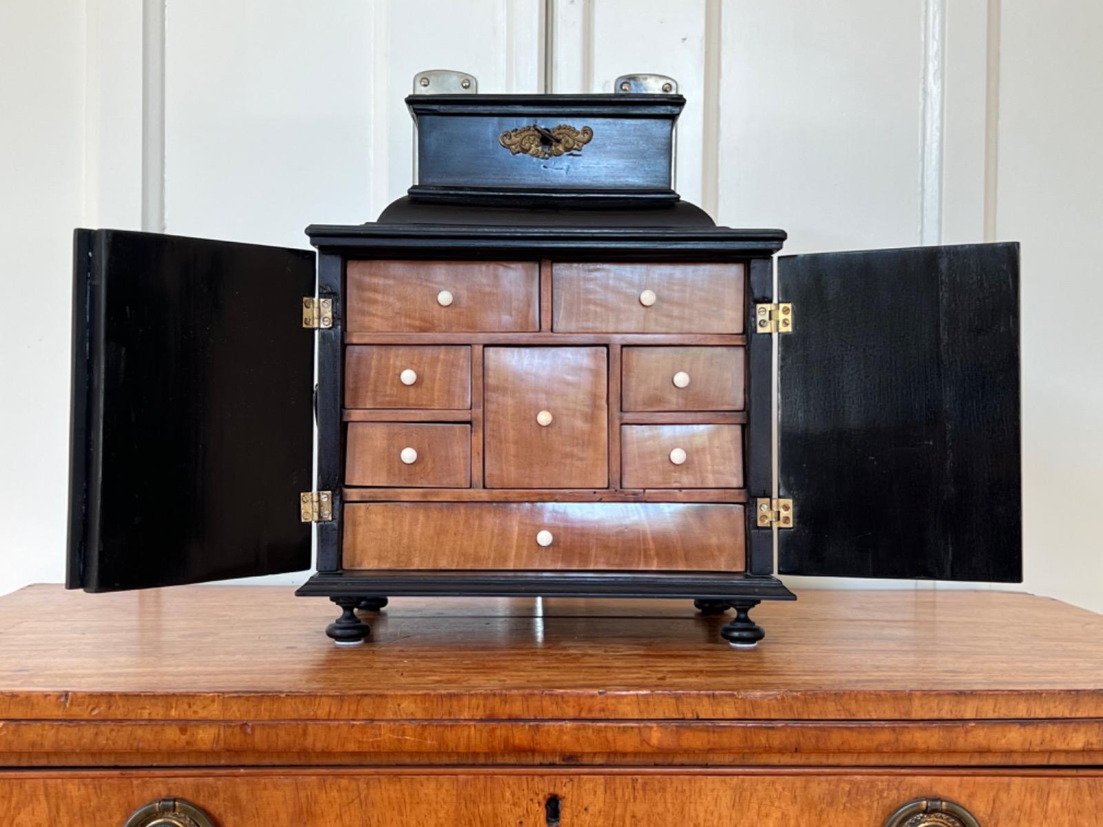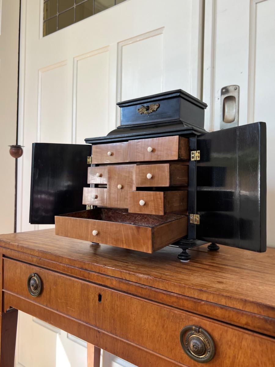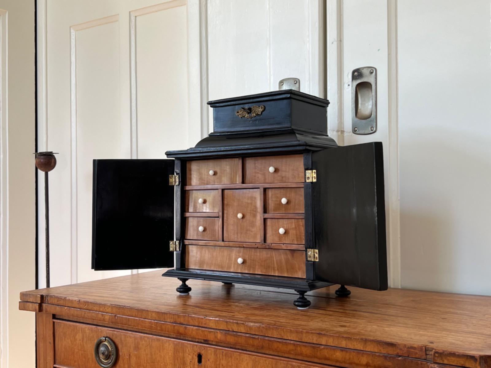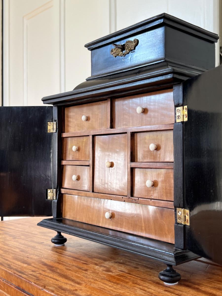 Ebben en gezwart perenhout gefineerd meubel met 8 kleine laden in diverse maten.