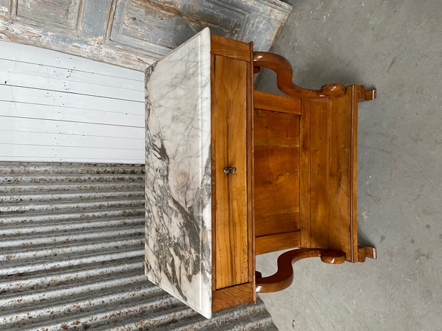 Kersenhouten trumeau met dik mamer en lade. Bianca carrara hardsteen id dik en gecontouneerd op de drie zicht kanten.