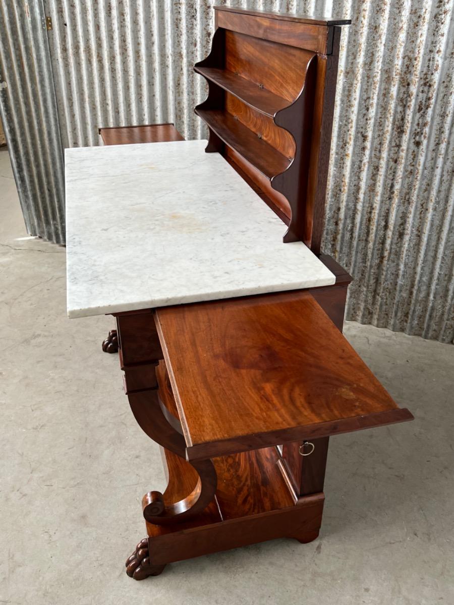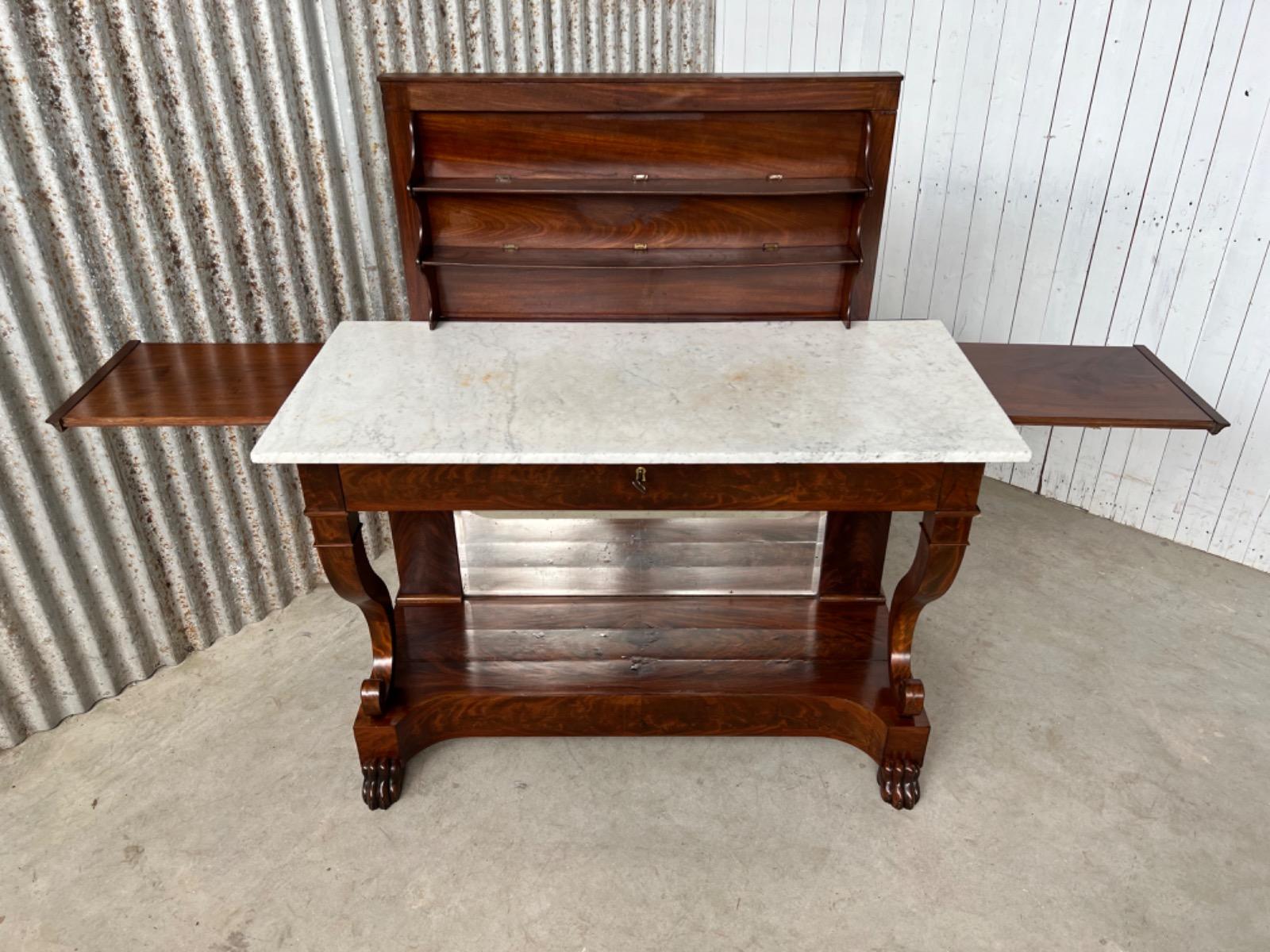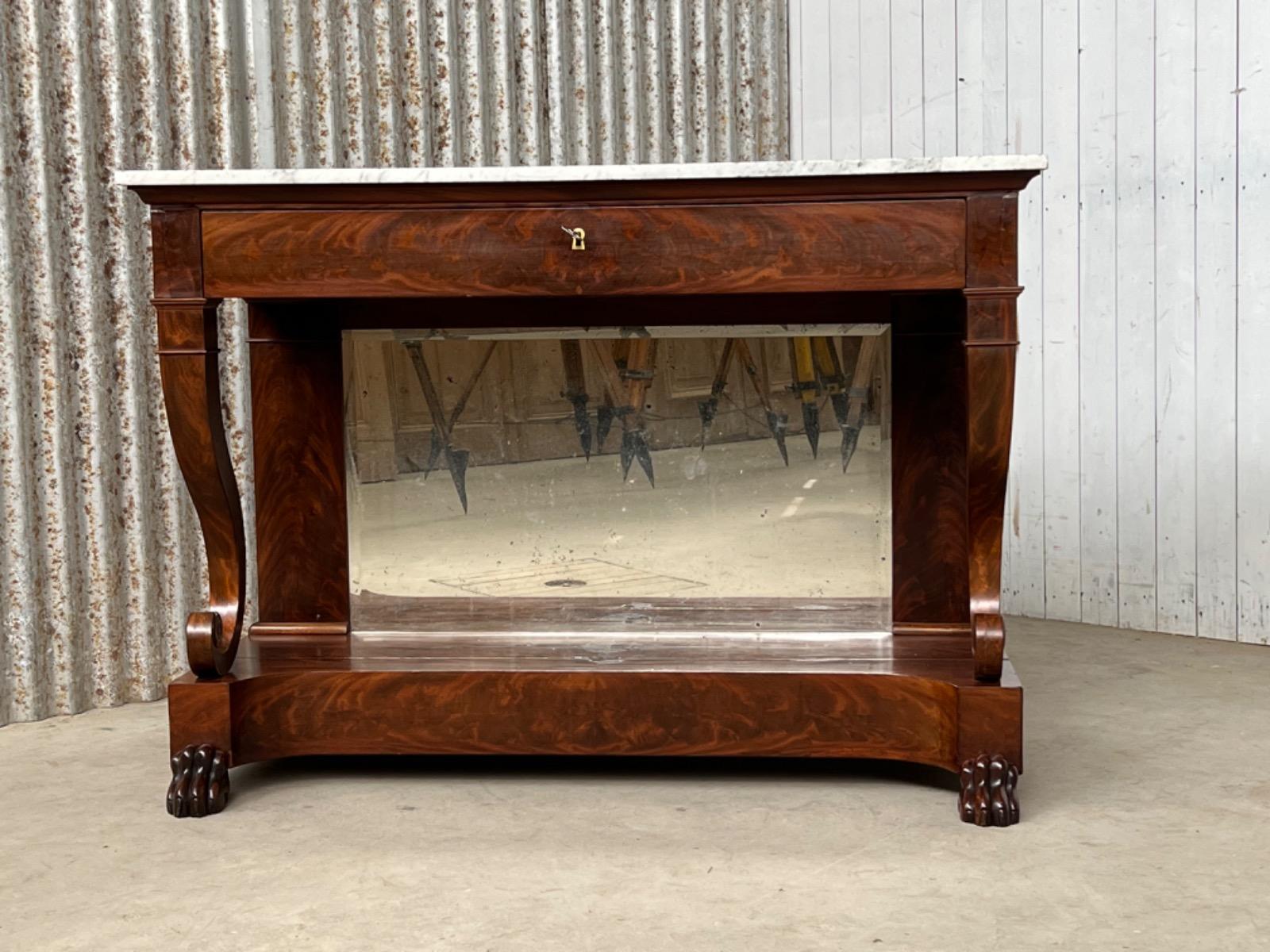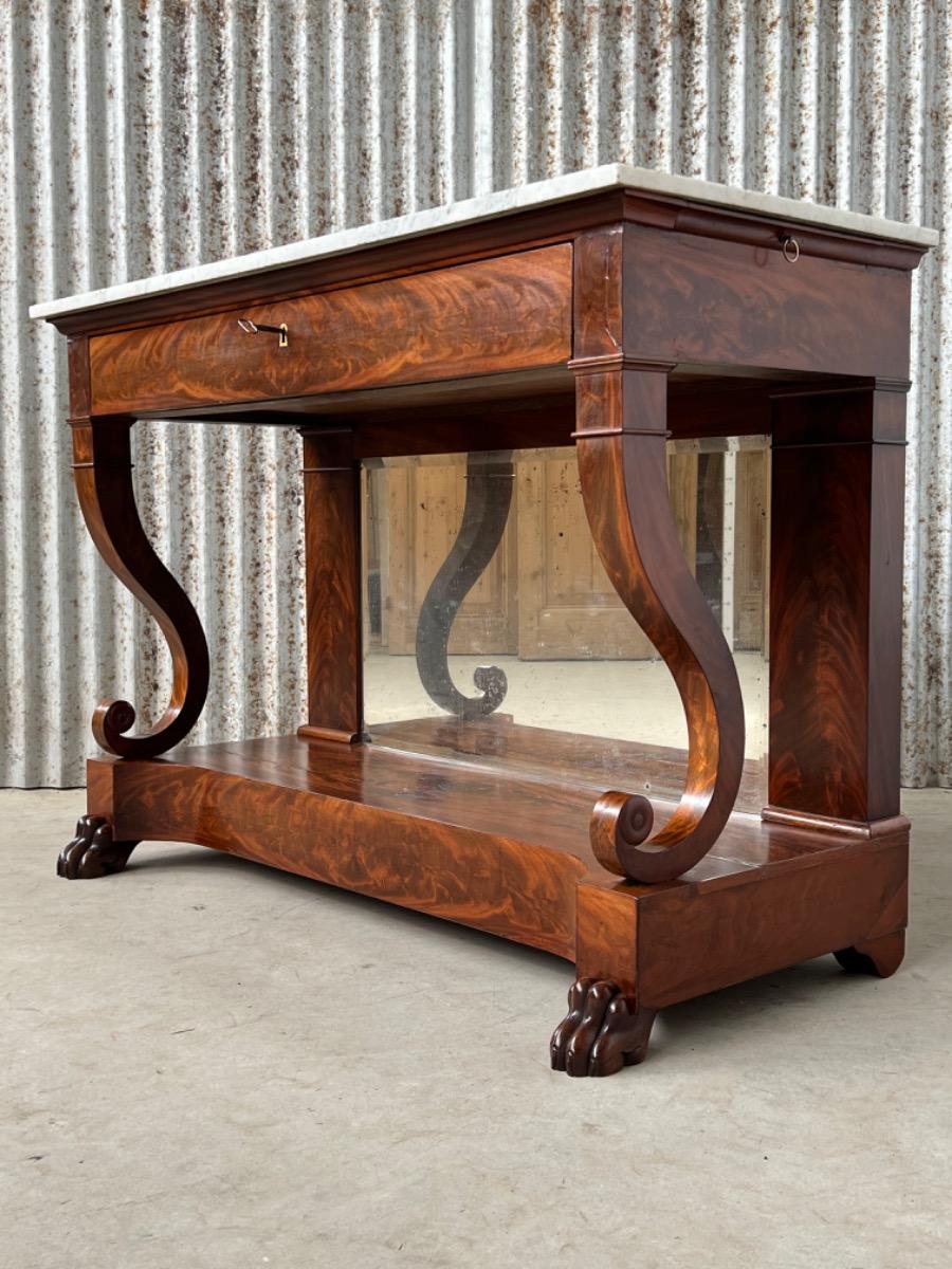 Mahonie consoletafel, trumeau met Bianca Carrara marmer en oorspronkelijk snijwerk.